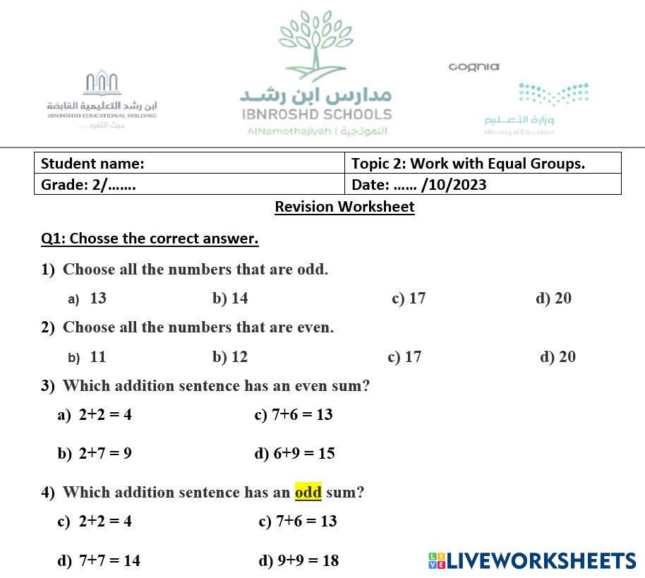 Created bynirmeen alhaj Math Arrays Age 7-6 level: grade 2 English Author's Instructions My Google Classroom Courses × 0 classes selected (0 students total) Quick Access Select all classes (0 classes) All Classes Loading courses... Cancel Share Share to selected Course __COURSE_NAME__ __STUDENT_NAME__ (__STUDENT_EMAIL__) Topic 2: Work with Equal Groups. Download Worksheet Validation Check my answers Emails my answers to my teacher Full name Group/level School subject Teacher's email or key code Close Submit Validating worksheet... (12) Your answers have been sent to your teacher. Good luck! OK We encountered an error submitting your answers. Please try again. OK Advertisement | Go Ad Free Created bynirmeen alhaj Math Arrays Age 7-6 level: grade 2 English Author's Instructions