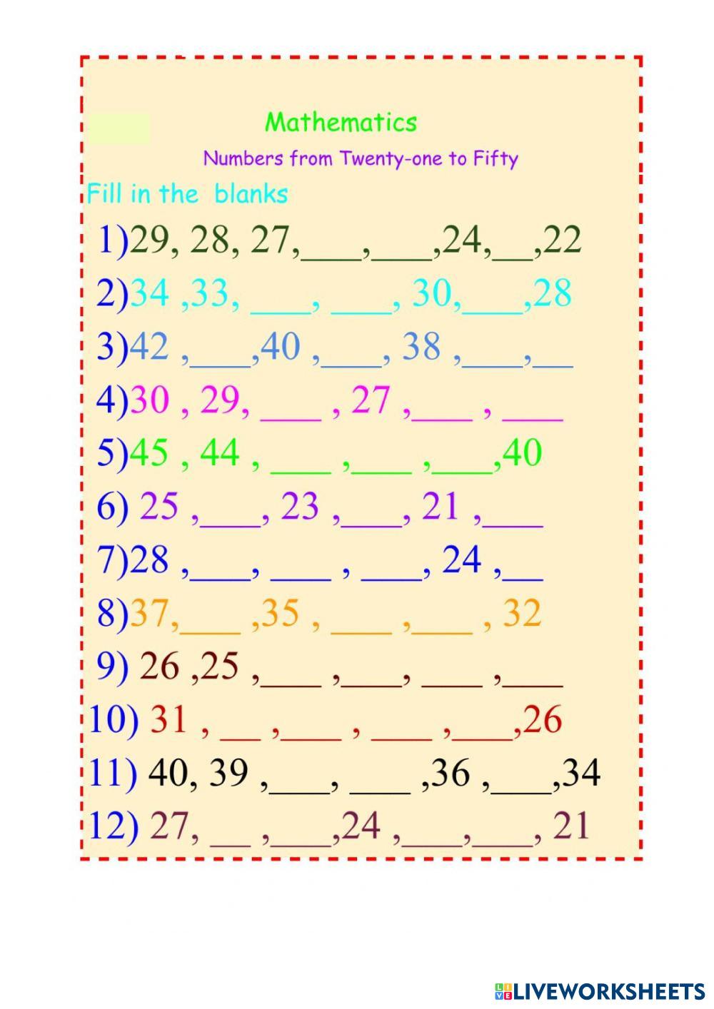 Created byAngie Math Counting Backwards Age 5-13 level: Grade 1 English Author's Instructions My Google Classroom Courses × 0 classes selected (0 students total) Quick Access Select all classes (0 classes) All Classes Loading courses... Cancel Share Share to selected Course __COURSE_NAME__ __STUDENT_NAME__ (__STUDENT_EMAIL__) Counting Backwards Download Worksheet Validation Check my answers Emails my answers to my teacher Full name Group/level School subject Teacher's email or key code Close Submit Validating worksheet... (12) Your answers have been sent to your teacher. Good luck! OK We encountered an error submitting your answers. Please try again. OK Advertisement | Go Ad Free Created byAngie Math Counting Backwards Age 5-13 level: Grade 1 English Author's Instructions
