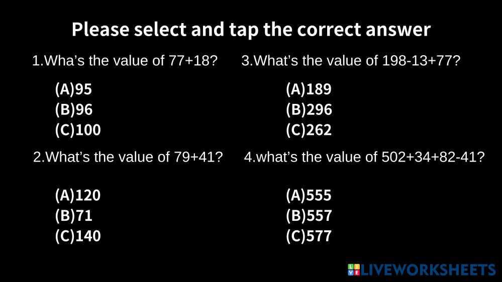 Created byJun Zan Liang Math Math calculation Age 5-10 level: 1 English Author's Instructions Calculate simple questions My Google Classroom Courses × 0 classes selected (0 students total) Quick Access Select all classes (0 classes) All Classes Loading courses... Cancel Share Share to selected Course __COURSE_NAME__ __STUDENT_NAME__ (__STUDENT_EMAIL__) Math Download Worksheet Validation Check my answers Emails my answers to my teacher Full name Group/level School subject Teacher's email or key code Close Submit Validating worksheet... (12) Your answers have been sent to your teacher. Good luck! OK We encountered an error submitting your answers. Please try again. OK Advertisement | Go Ad Free Created byJun Zan Liang Math Math calculation Age 5-10 level: 1 English Author's Instructions Calculate simple questions