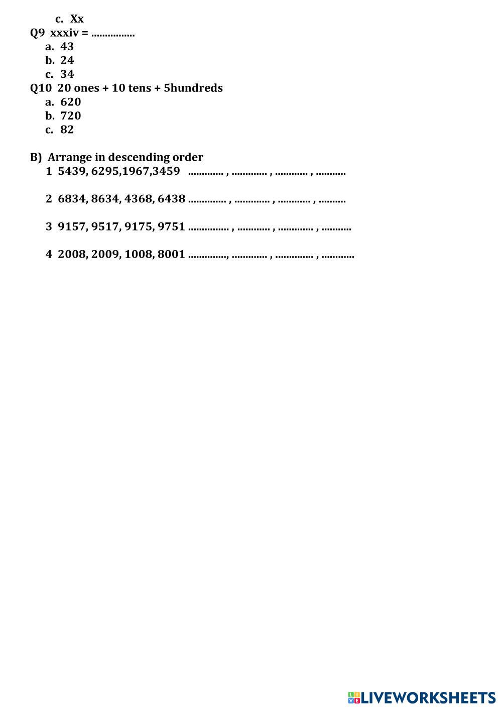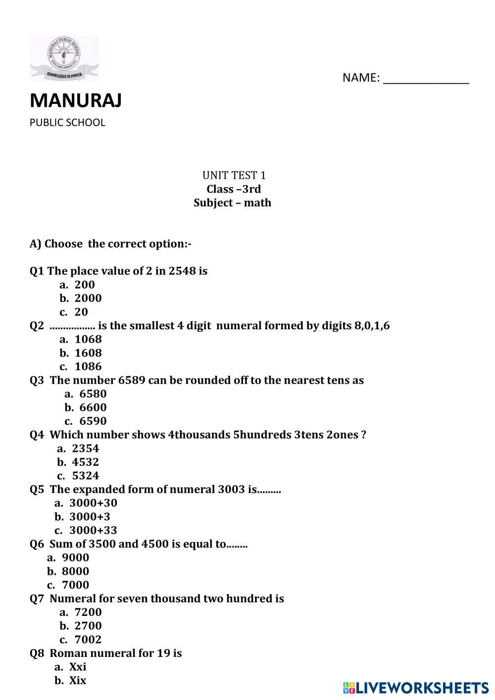 Created bysamarth math mcq Age 9-13 level: 3 English Author's Instructions My Google Classroom Courses × 0 classes selected (0 students total) Quick Access Select all classes (0 classes) All Classes Loading courses... Cancel Share Share to selected Course __COURSE_NAME__ __STUDENT_NAME__ (__STUDENT_EMAIL__) unit test 1 Download Worksheet Validation Check my answers Emails my answers to my teacher Full name Group/level School subject Teacher's email or key code Close Submit Validating worksheet... (12) Your answers have been sent to your teacher. Good luck! OK We encountered an error submitting your answers. Please try again. OK Advertisement | Go Ad Free Created bysamarth math mcq Age 9-13 level: 3 English Author's Instructions