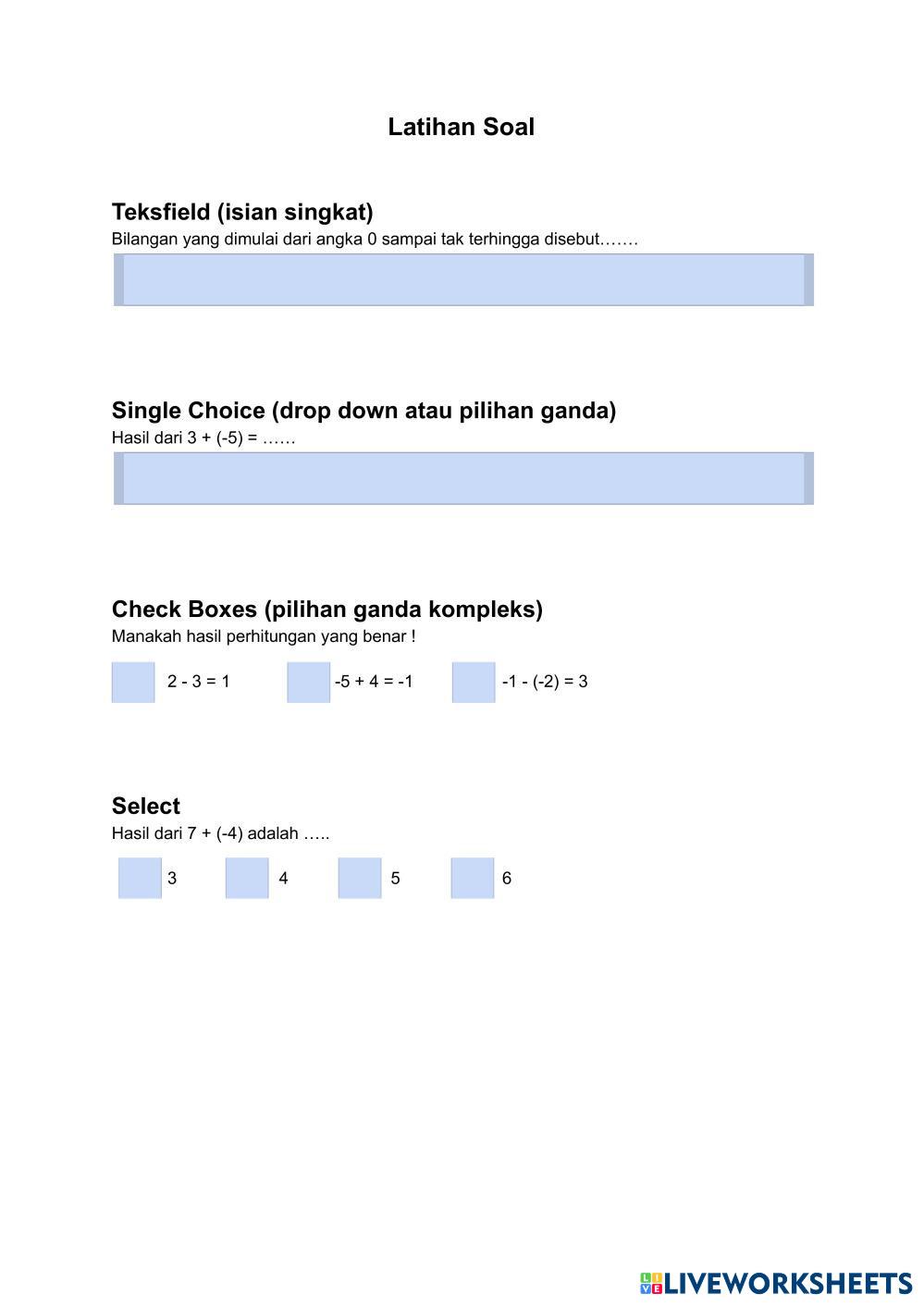Created bySaida Dewi Ananda Math Bilangan Age 11-15 level: 7 English Author's Instructions My Google Classroom Courses × 0 classes selected (0 students total) Quick Access Select all classes (0 classes) All Classes Loading courses... Cancel Share Share to selected Course __COURSE_NAME__ __STUDENT_NAME__ (__STUDENT_EMAIL__) Latihan Soal Bilangan Bulat Download Worksheet Validation Check my answers Emails my answers to my teacher Full name Group/level School subject Teacher's email or key code Close Submit Validating worksheet... (12) Your answers have been sent to your teacher. Good luck! OK We encountered an error submitting your answers. Please try again. OK Advertisement | Go Ad Free Created bySaida Dewi Ananda Math Bilangan Age 11-15 level: 7 English Author's Instructions