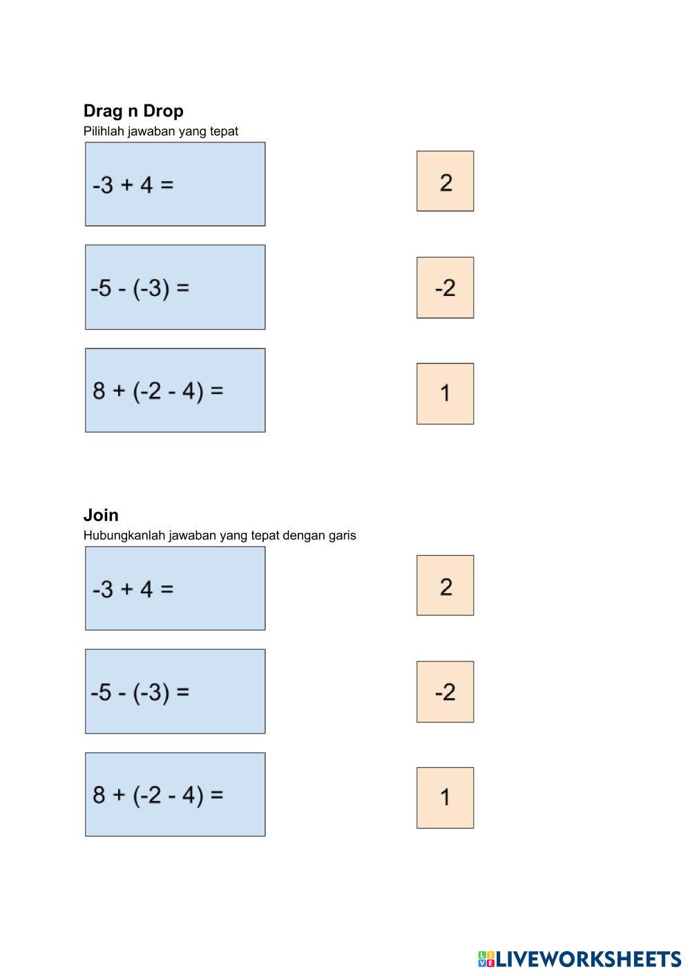 Created bySaida Dewi Ananda Math Bilangan Age 11-16 level: SMP English Author's Instructions My Google Classroom Courses × 0 classes selected (0 students total) Quick Access Select all classes (0 classes) All Classes Loading courses... Cancel Share Share to selected Course __COURSE_NAME__ __STUDENT_NAME__ (__STUDENT_EMAIL__) Latihan Soal Bilangan Bulat Download Worksheet Validation Check my answers Emails my answers to my teacher Full name Group/level School subject Teacher's email or key code Close Submit Validating worksheet... (12) Your answers have been sent to your teacher. Good luck! OK We encountered an error submitting your answers. Please try again. OK Advertisement | Go Ad Free Created bySaida Dewi Ananda Math Bilangan Age 11-16 level: SMP English Author's Instructions