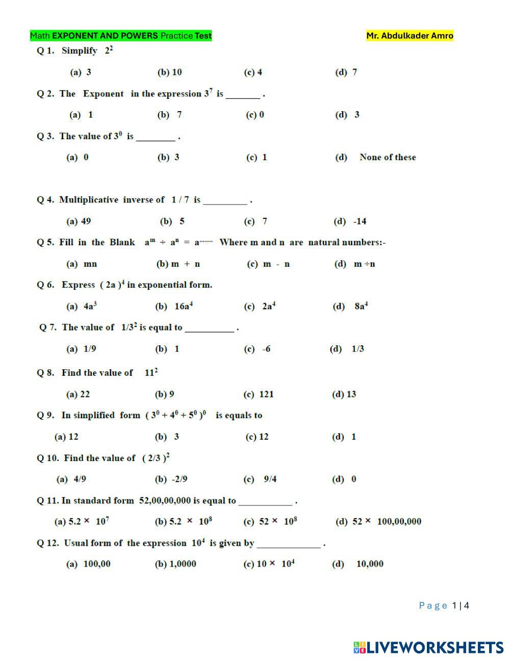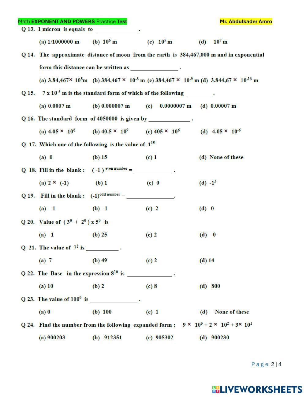 Math EXPONENT AND POWERS Practice Test For Grade 5 to 8