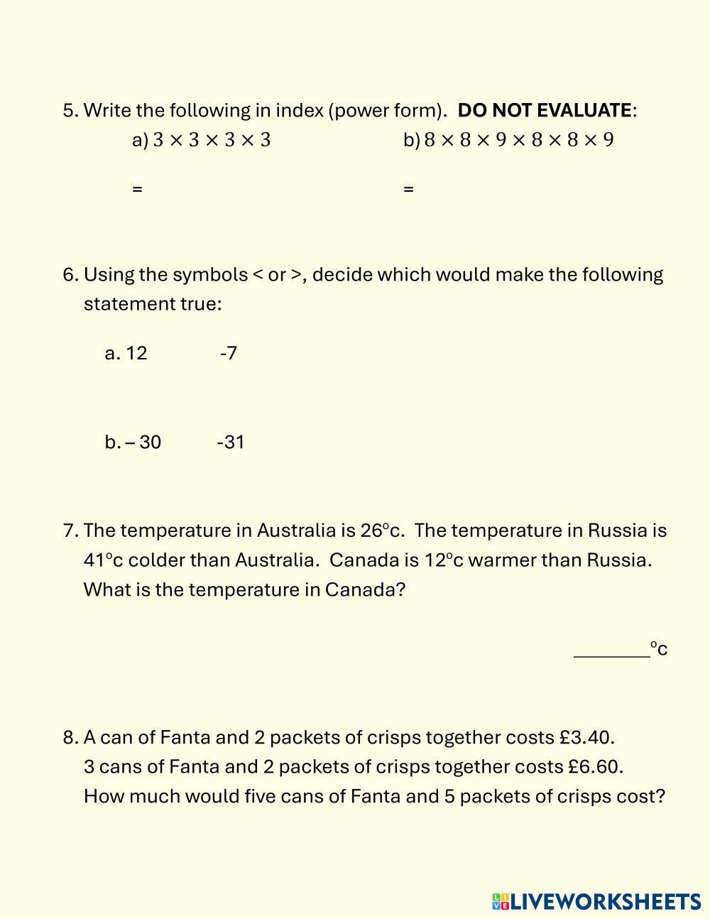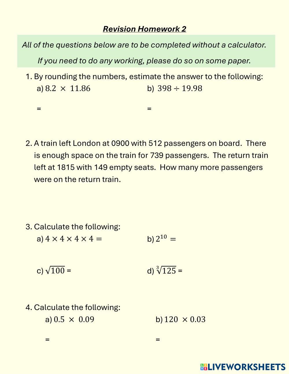 Created by alloamaths Math Homework Age 8-18 level: Level 3 to 4 English Author's Instructions My Google Classroom Courses × 0 classes selected (0 students total) Quick Access Select all classes (0 classes) All Classes Loading courses... Cancel Share Share to selected Course __COURSE_NAME__ __STUDENT_NAME__ (__STUDENT_EMAIL__) Revision HW2 Download Worksheet Validation Check my answers Emails my answers to my teacher Full name Group/level School subject Teacher's email or key code Close Submit Validating worksheet... (12) Your answers have been sent to your teacher. Good luck! OK We encountered an error submitting your answers. Please try again. OK Advertisement | Go Ad Free Created by alloamaths Math Homework Age 8-18 level: Level 3 to 4 English Author's Instructions