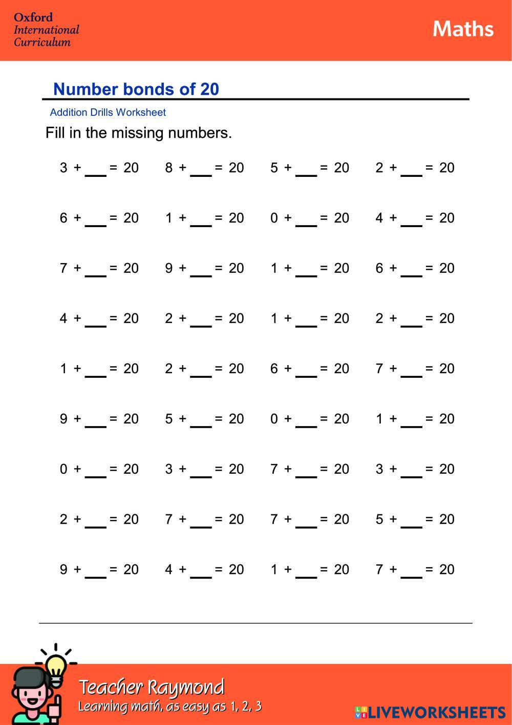 Created byUK Academy Binh Thanh Math Bonds of 20 Age 8-11 level: 2 English Author's Instructions My Google Classroom Courses × 0 classes selected (0 students total) Quick Access Select all classes (0 classes) All Classes Loading courses... Cancel Share Share to selected Course __COURSE_NAME__ __STUDENT_NAME__ (__STUDENT_EMAIL__) Bonds of 20 Download Worksheet Validation Check my answers Emails my answers to my teacher Full name Group/level School subject Teacher's email or key code Close Submit Validating worksheet... (12) Your answers have been sent to your teacher. Good luck! OK We encountered an error submitting your answers. Please try again. OK Advertisement | Go Ad Free Created byUK Academy Binh Thanh Math Bonds of 20 Age 8-11 level: 2 English Author's Instructions