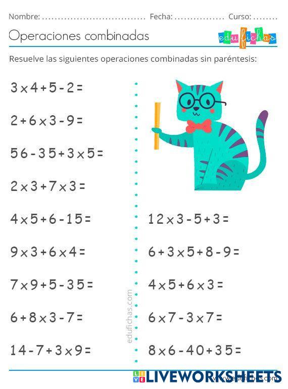 Created byMaría Ángel Hurtado Marín Math Pemdas Age 9-13 level: 2 English Author's Instructions My Google Classroom Courses × 0 classes selected (0 students total) Quick Access Select all classes (0 classes) All Classes Loading courses... Cancel Share Share to selected Course __COURSE_NAME__ __STUDENT_NAME__ (__STUDENT_EMAIL__) exercises with a cat Download Worksheet Validation Check my answers Emails my answers to my teacher Full name Group/level School subject Teacher's email or key code Close Submit Validating worksheet... (12) Your answers have been sent to your teacher. Good luck! OK We encountered an error submitting your answers. Please try again. OK Advertisement | Go Ad Free Created byMaría Ángel Hurtado Marín Math Pemdas Age 9-13 level: 2 English Author's Instructions