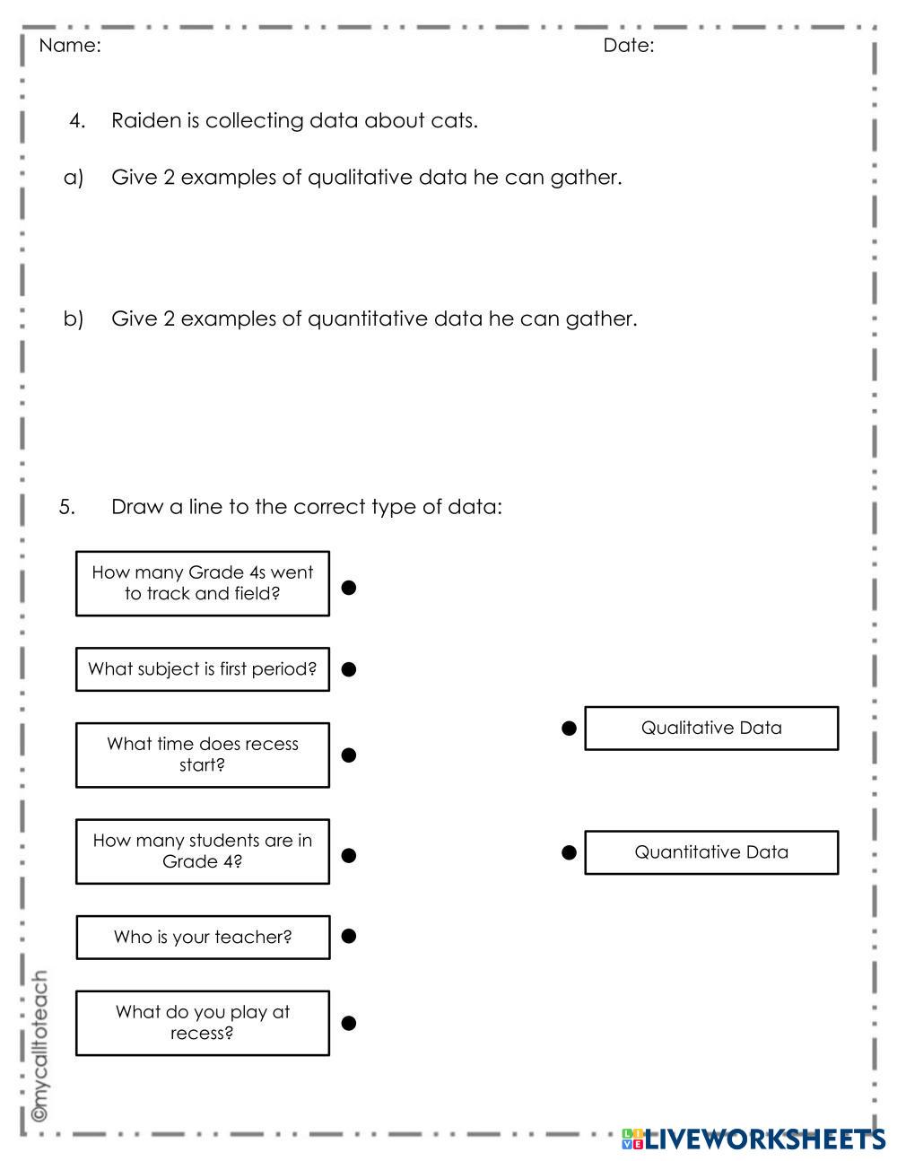 Created bymala Math Data Literacy Age 8-12 level: 4 English Author's Instructions My Google Classroom Courses × 0 classes selected (0 students total) Quick Access Select all classes (0 classes) All Classes Loading courses... Cancel Share Share to selected Course __COURSE_NAME__ __STUDENT_NAME__ (__STUDENT_EMAIL__) Types of Data: Quantitative vs Qualitative Download Worksheet Validation Check my answers Emails my answers to my teacher Full name Group/level School subject Teacher's email or key code Close Submit Validating worksheet... (12) Your answers have been sent to your teacher. Good luck! OK We encountered an error submitting your answers. Please try again. OK Advertisement | Go Ad Free Created bymala Math Data Literacy Age 8-12 level: 4 English Author's Instructions