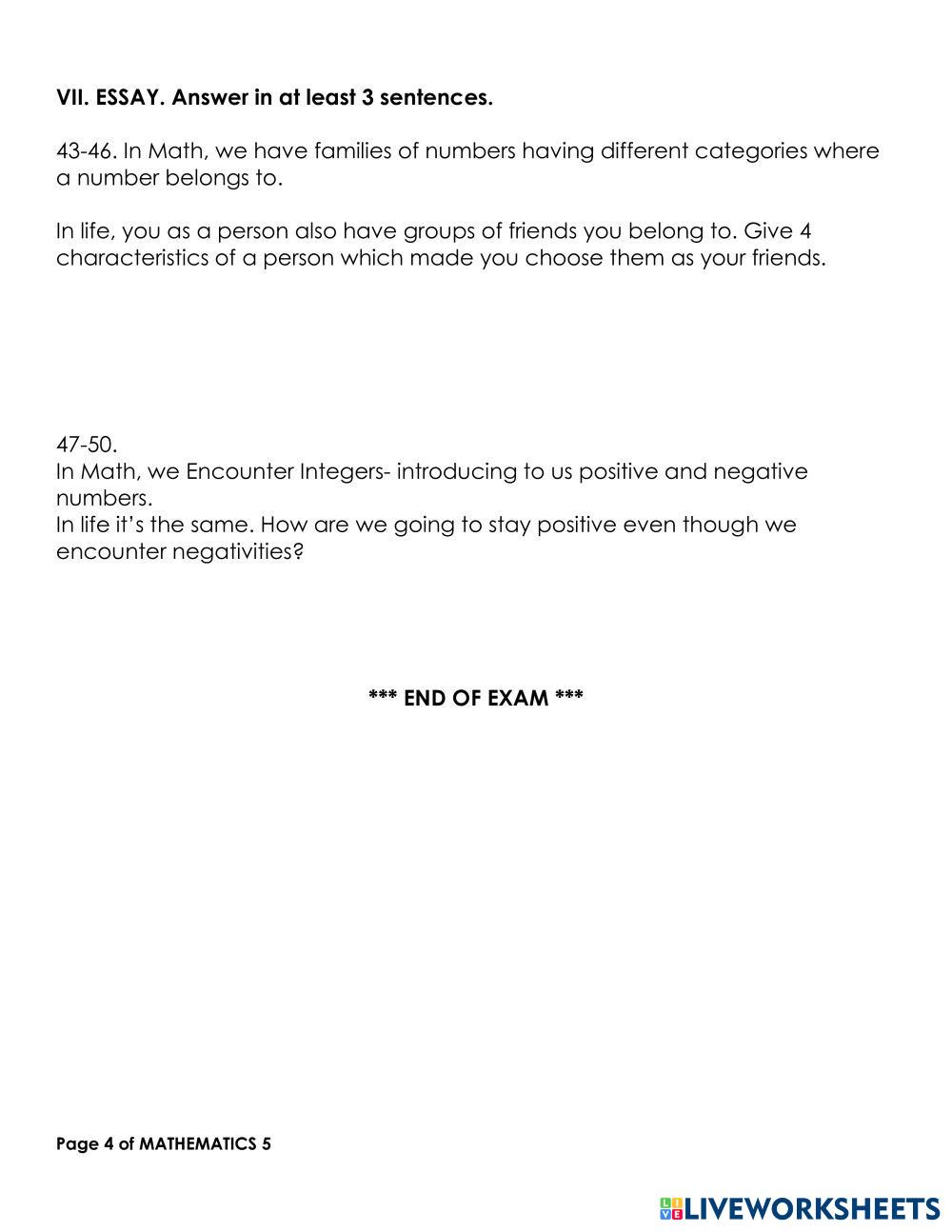 Created by jovidoreynan Math Math exam Age 11+ level: 5 English Author's Instructions My Google Classroom Courses × 0 classes selected (0 students total) Quick Access Select all classes (0 classes) All Classes Loading courses... Cancel Share Share to selected Course __COURSE_NAME__ __STUDENT_NAME__ (__STUDENT_EMAIL__) MATH 5 3rd Download Worksheet Validation Check my answers Emails my answers to my teacher Full name Group/level School subject Teacher's email or key code Close Submit Validating worksheet... (12) Your answers have been sent to your teacher. Good luck! OK We encountered an error submitting your answers. Please try again. OK Advertisement | Go Ad Free Created by jovidoreynan Math Math exam Age 11+ level: 5 English Author's Instructions