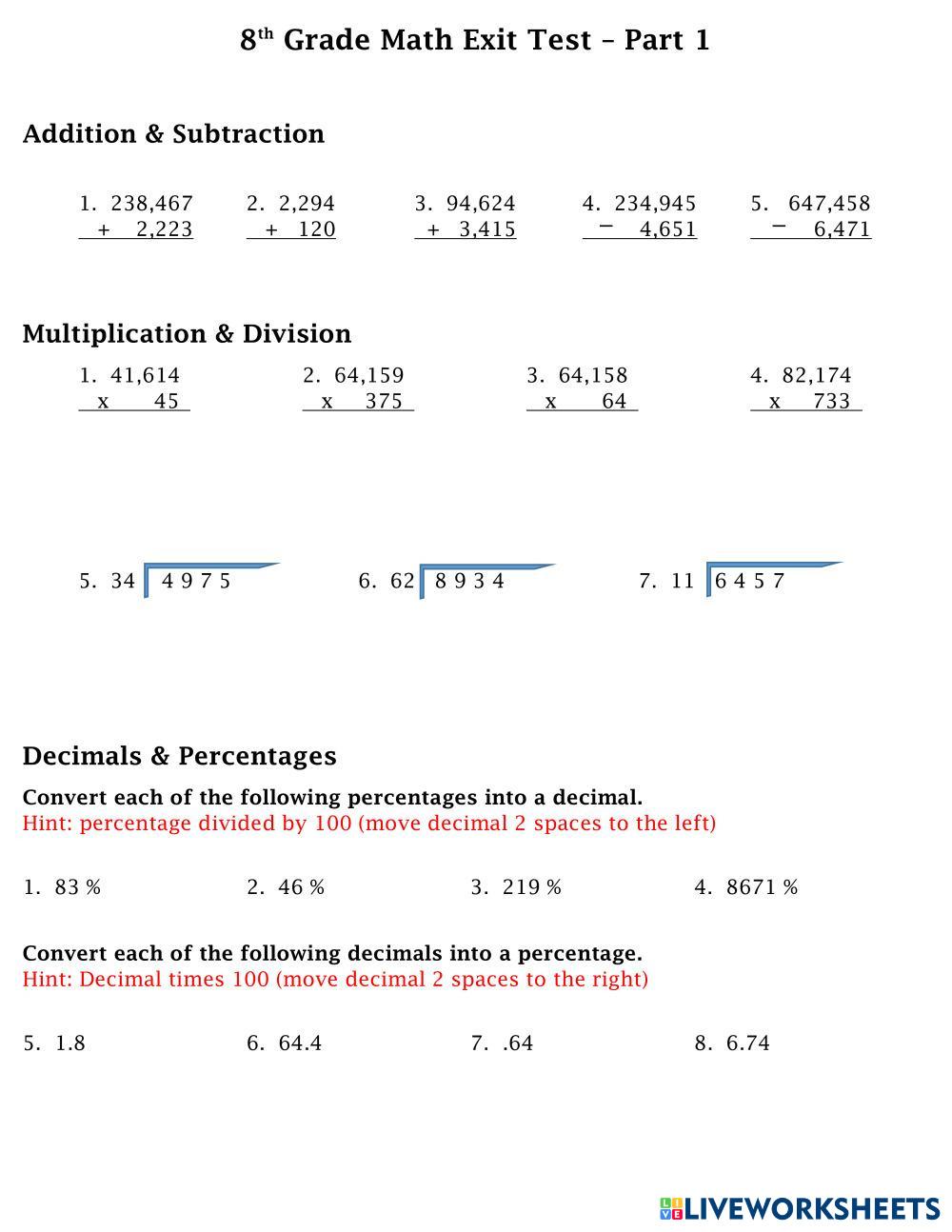 Created byAmy Gaspard Amy Math Exit Ticket Age 11-15 level: 8th English Author's Instructions My Google Classroom Courses × 0 classes selected (0 students total) Quick Access Select all classes (0 classes) All Classes Loading courses... Cancel Share Share to selected Course __COURSE_NAME__ __STUDENT_NAME__ (__STUDENT_EMAIL__) 8th Grade Math Exit Test – Part 1 Download Worksheet Validation Check my answers Emails my answers to my teacher Full name Group/level School subject Teacher's email or key code Close Submit Validating worksheet... (12) Your answers have been sent to your teacher. Good luck! OK We encountered an error submitting your answers. Please try again. OK Advertisement | Go Ad Free Created byAmy Gaspard Amy Math Exit Ticket Age 11-15 level: 8th English Author's Instructions