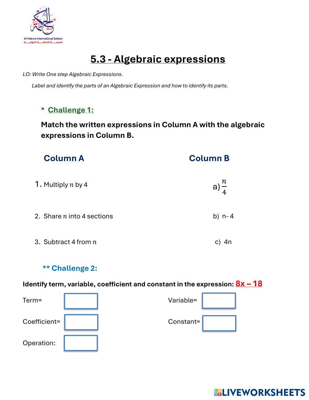 Created byHuda Mohamed Mathematics 5.3 Lesson 5.3 Age 11-15 level: Grade 6 English Author's Instructions My Google Classroom Courses × 0 classes selected (0 students total) Quick Access Select all classes (0 classes) All Classes Loading courses... Cancel Share Share to selected Course __COURSE_NAME__ __STUDENT_NAME__ (__STUDENT_EMAIL__) 5.3 - Writing algebraic expressions Download Worksheet Validation Check my answers Emails my answers to my teacher Full name Group/level School subject Teacher's email or key code Close Submit Validating worksheet... (12) Your answers have been sent to your teacher. Good luck! OK We encountered an error submitting your answers. Please try again. OK Advertisement | Go Ad Free Created byHuda Mohamed Mathematics 5.3 Lesson 5.3 Age 11-15 level: Grade 6 English Author's Instructions