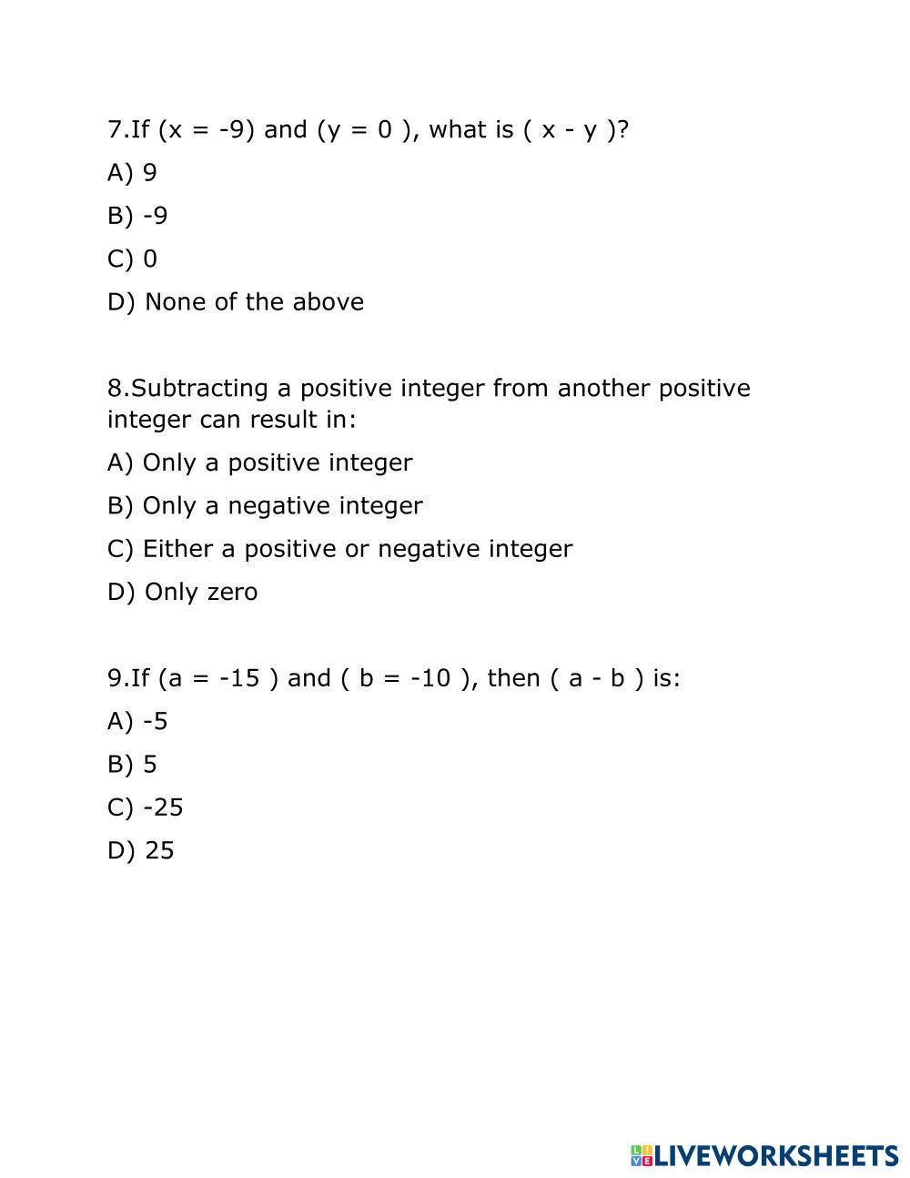 Created byKalaivani Sivan MATHEMATICS PROPERTIES OF INTEGERS Age 7-18 level: LEVEL 1 English Author's Instructions My Google Classroom Courses × 0 classes selected (0 students total) Quick Access Select all classes (0 classes) All Classes Loading courses... Cancel Share Share to selected Course __COURSE_NAME__ __STUDENT_NAME__ (__STUDENT_EMAIL__) CODINGAL Download Worksheet Validation Check my answers Emails my answers to my teacher Full name Group/level School subject Teacher's email or key code Close Submit Validating worksheet... (12) Your answers have been sent to your teacher. Good luck! OK We encountered an error submitting your answers. Please try again. OK Advertisement | Go Ad Free Created byKalaivani Sivan MATHEMATICS PROPERTIES OF INTEGERS Age 7-18 level: LEVEL 1 English Author's Instructions