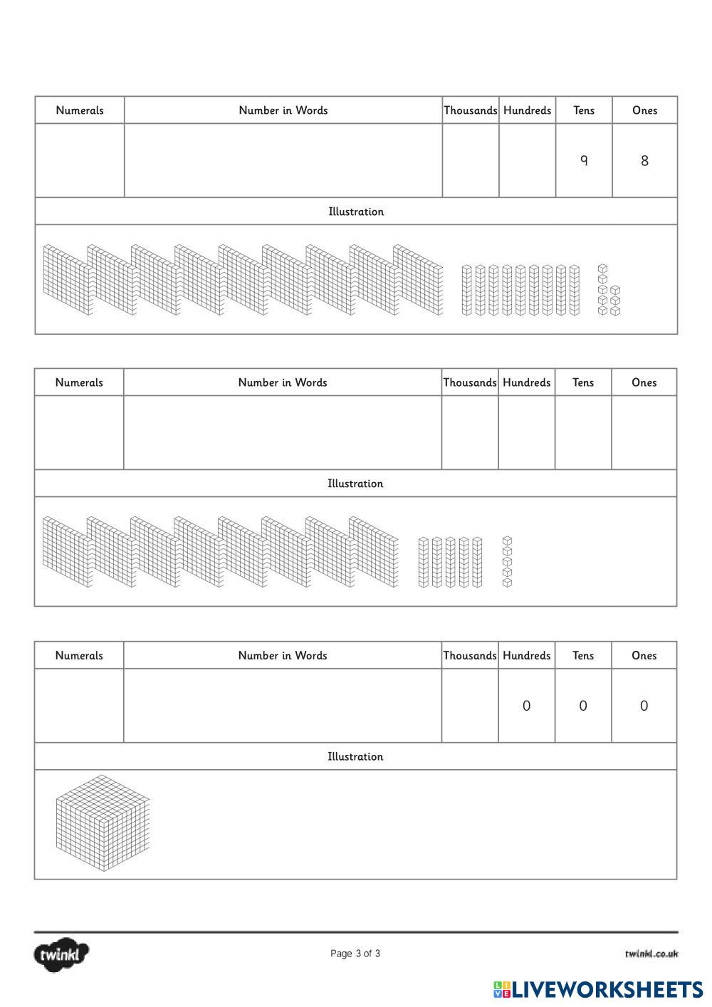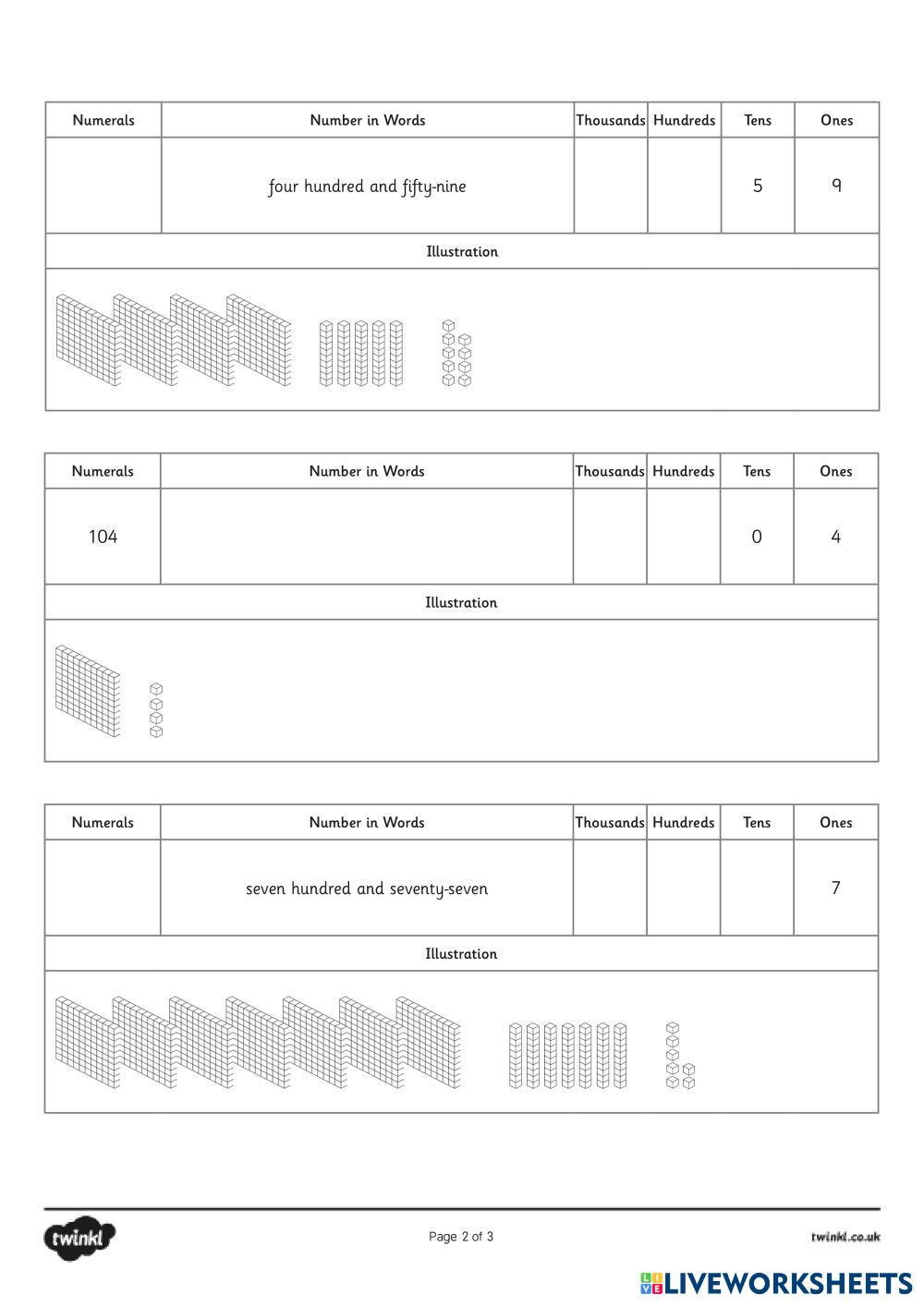 Look at the hundred, tens, and unit blocks. Write the number is numeral and word forms.