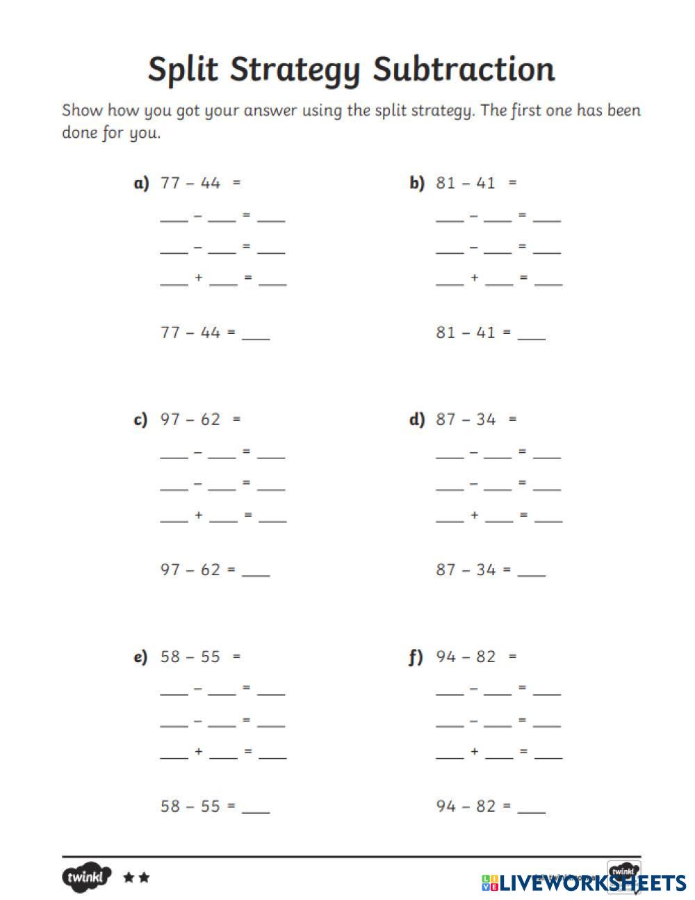 Created byVina Ricohermoso Maths Subtraction Age 7-11 level: Year 2 English Author's Instructions My Google Classroom Courses × 0 classes selected (0 students total) Quick Access Select all classes (0 classes) All Classes Loading courses... Cancel Share Share to selected Course __COURSE_NAME__ __STUDENT_NAME__ (__STUDENT_EMAIL__) Split Strategy for Subtraction Download Worksheet Validation Check my answers Emails my answers to my teacher Full name Group/level School subject Teacher's email or key code Close Submit Validating worksheet... (12) Your answers have been sent to your teacher. Good luck! OK We encountered an error submitting your answers. Please try again. OK Advertisement | Go Ad Free Created byVina Ricohermoso Maths Subtraction Age 7-11 level: Year 2 English Author's Instructions