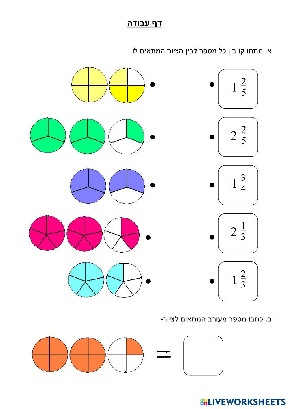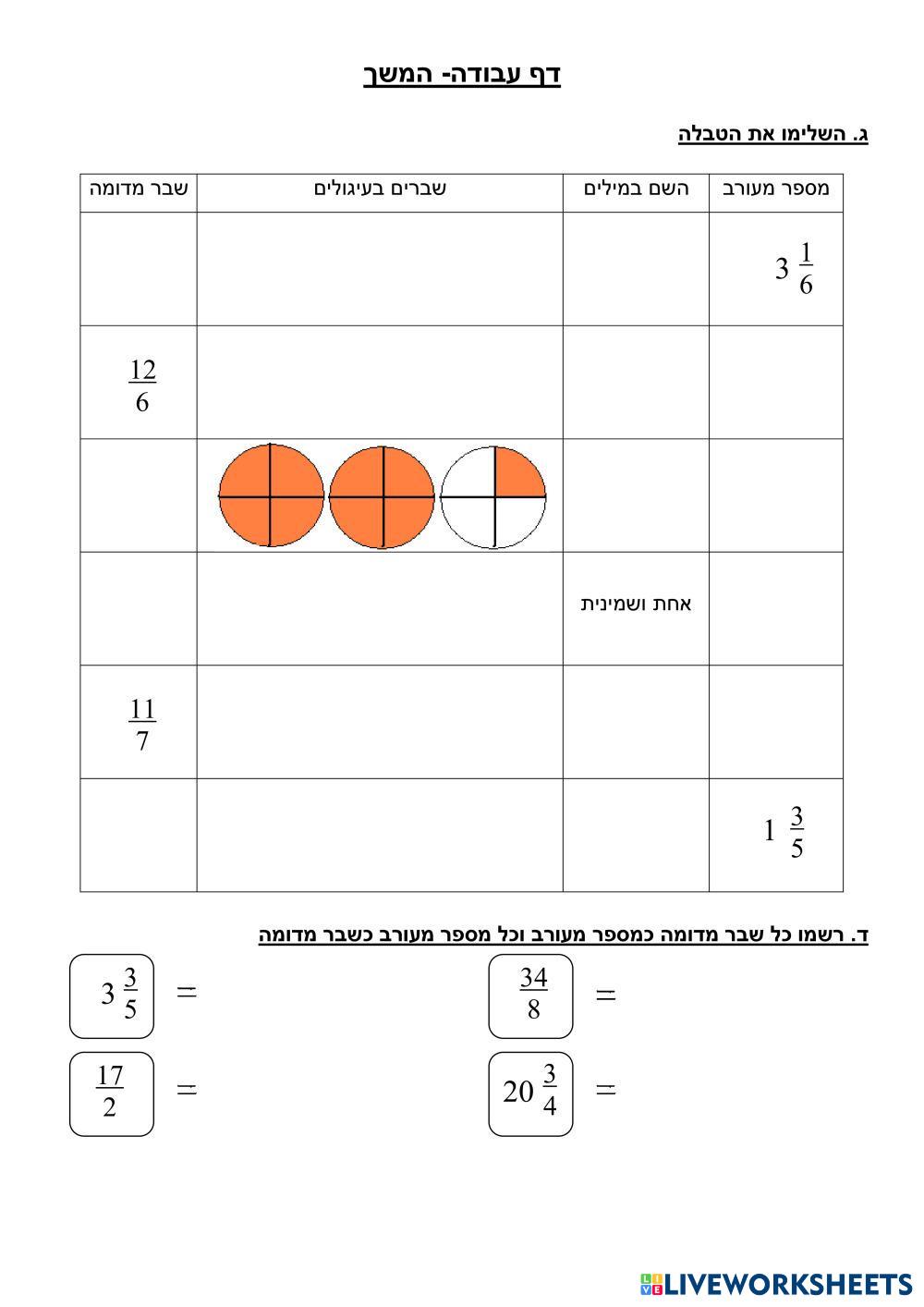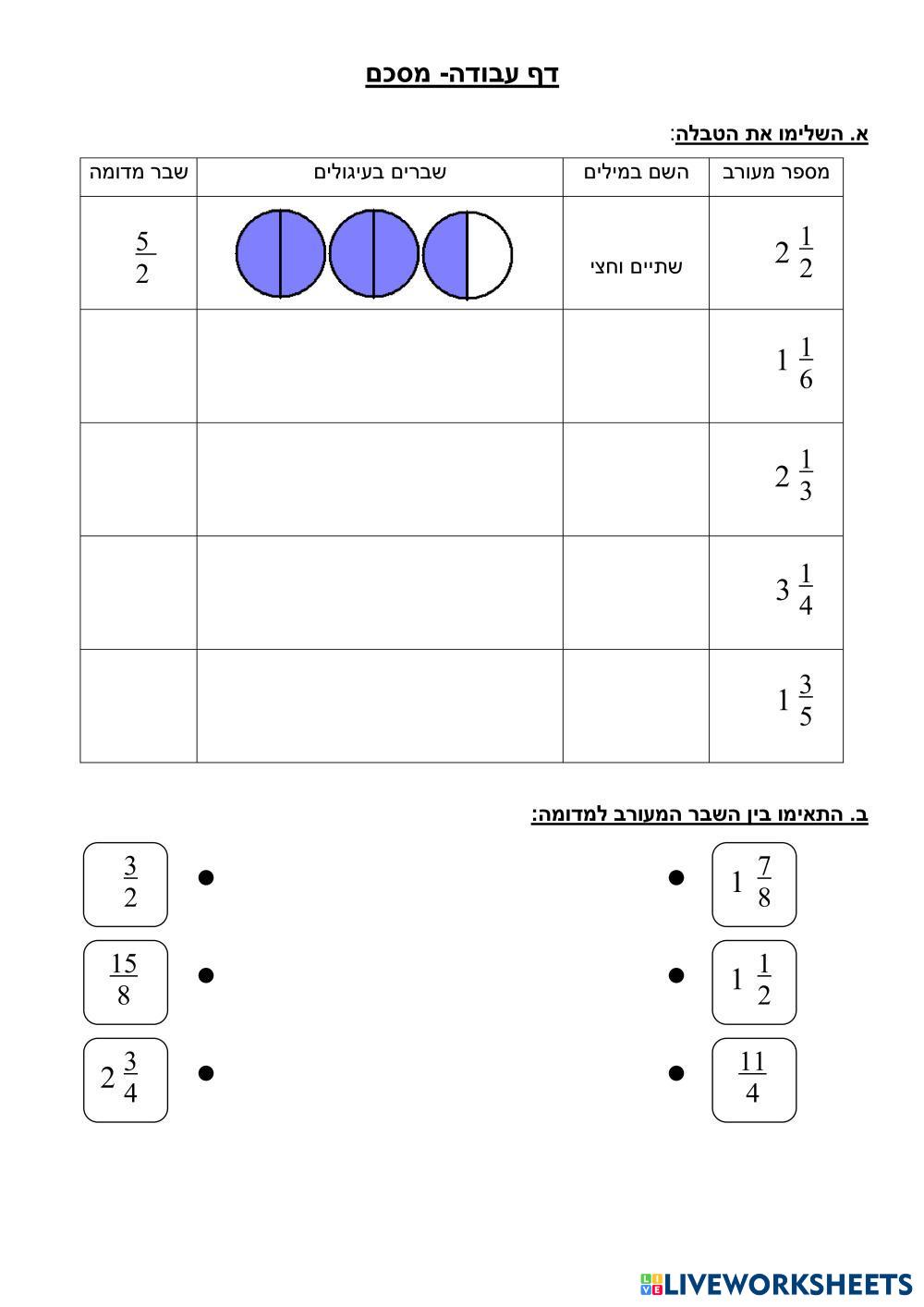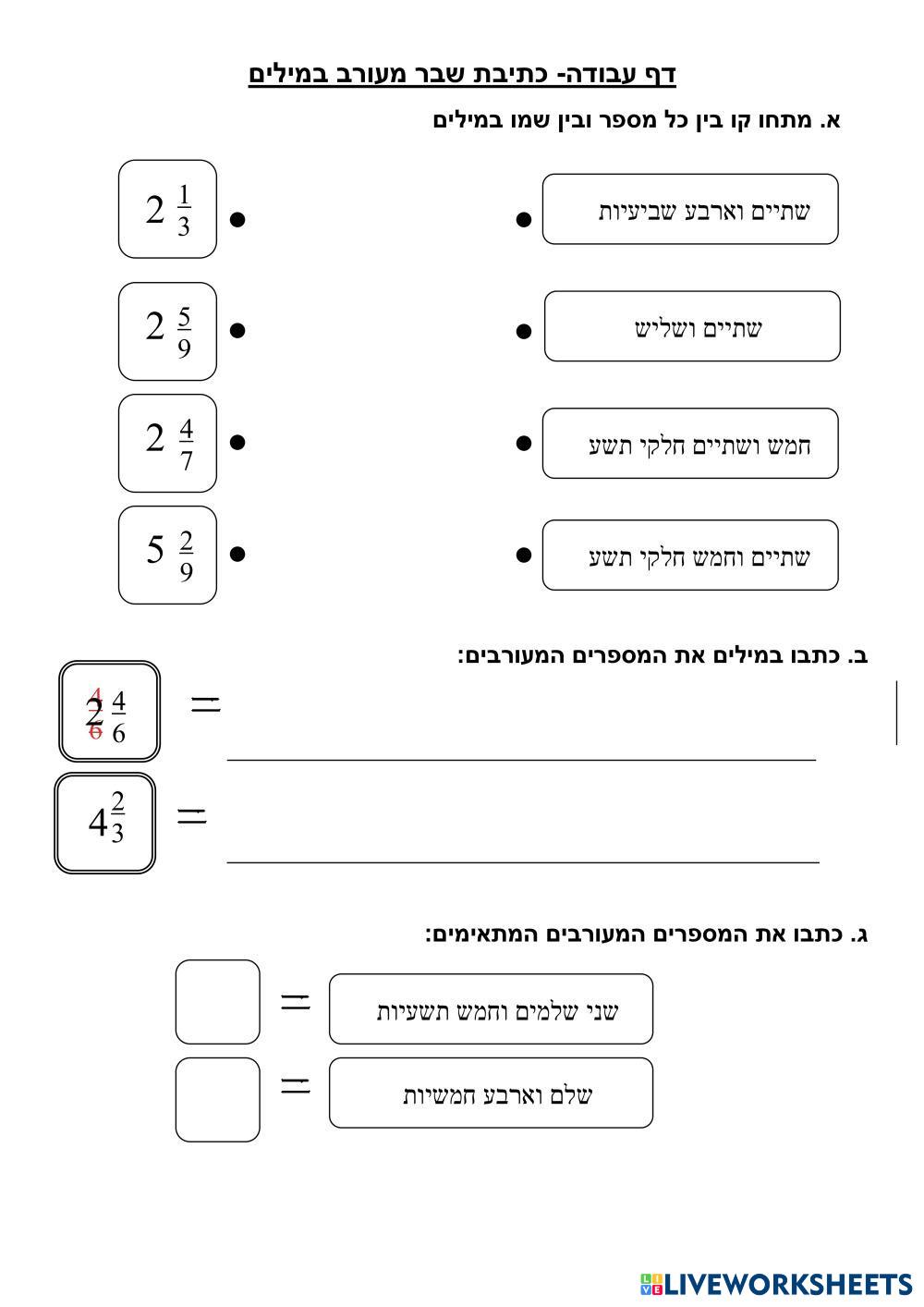 Created byyamit cohen מתמטיקה הפיכת מספר מעורב לשבר גדול מ - 1 ולהיפך Age 9-14 level: ה' English Author's Instructions My Google Classroom Courses × 0 classes selected (0 students total) Quick Access Select all classes (0 classes) All Classes Loading courses... Cancel Share Share to selected Course __COURSE_NAME__ __STUDENT_NAME__ (__STUDENT_EMAIL__) ולהפךמספר מעורב Download Worksheet Validation Check my answers Emails my answers to my teacher Full name Group/level School subject Teacher's email or key code Close Submit Validating worksheet... (12) Your answers have been sent to your teacher. Good luck! OK We encountered an error submitting your answers. Please try again. OK Advertisement | Go Ad Free Created byyamit cohen מתמטיקה הפיכת מספר מעורב לשבר גדול מ - 1 ולהיפך Age 9-14 level: ה' English Author's Instructions