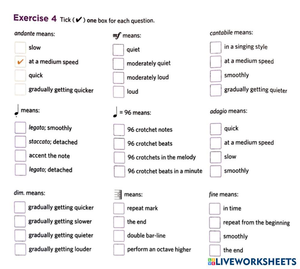Created by canzona Music Music Age 9-15 level: Music English Author's Instructions My Google Classroom Courses × 0 classes selected (0 students total) Quick Access Select all classes (0 classes) All Classes Loading courses... Cancel Share Share to selected Course __COURSE_NAME__ __STUDENT_NAME__ (__STUDENT_EMAIL__) Musical Term Part 2 Download Worksheet Validation Check my answers Emails my answers to my teacher Full name Group/level School subject Teacher's email or key code Close Submit Validating worksheet... (12) Your answers have been sent to your teacher. Good luck! OK We encountered an error submitting your answers. Please try again. OK Advertisement | Go Ad Free Created by canzona Music Music Age 9-15 level: Music English Author's Instructions