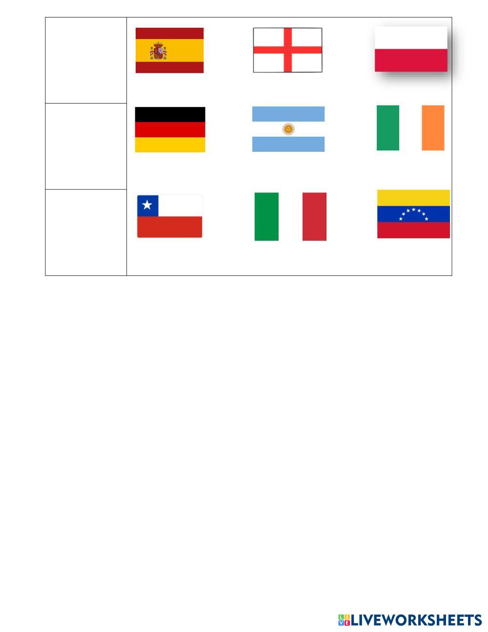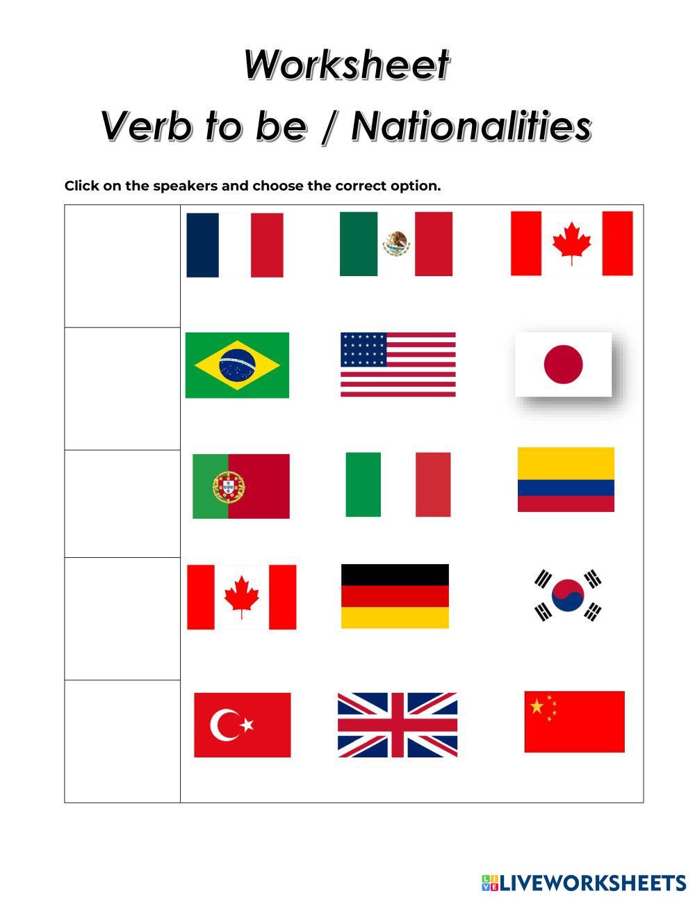 Created byDaniela Díaz Nationalities Nationalities Age 15-14 level: A1 English Author's Instructions My Google Classroom Courses × 0 classes selected (0 students total) Quick Access Select all classes (0 classes) All Classes Loading courses... Cancel Share Share to selected Course __COURSE_NAME__ __STUDENT_NAME__ (__STUDENT_EMAIL__) Listening activity (Verb to be and Vocabulary of nationalities) Download Worksheet Validation Check my answers Emails my answers to my teacher Full name Group/level School subject Teacher's email or key code Close Submit Validating worksheet... (12) Your answers have been sent to your teacher. Good luck! OK We encountered an error submitting your answers. Please try again. OK Advertisement | Go Ad Free Created byDaniela Díaz Nationalities Nationalities Age 15-14 level: A1 English Author's Instructions