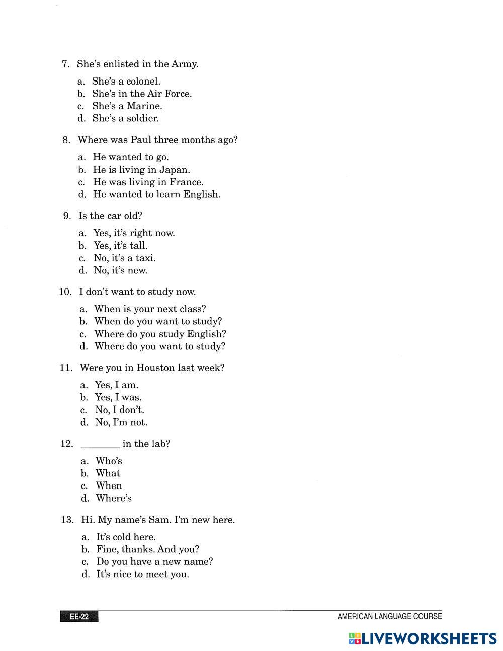 Created byluna English as a Second Language (ESL) Review Age 15+ level: HIGHSCHOOL English Author's Instructions My Google Classroom Courses × 0 classes selected (0 students total) Quick Access Select all classes (0 classes) All Classes Loading courses... Cancel Share Share to selected Course __COURSE_NAME__ __STUDENT_NAME__ (__STUDENT_EMAIL__) EVALUATION EXERCISES LESSON 4 BOOK 3 Download Worksheet Validation Check my answers Emails my answers to my teacher Full name Group/level School subject Teacher's email or key code Close Submit Validating worksheet... (12) Your answers have been sent to your teacher. Good luck! OK We encountered an error submitting your answers. Please try again. OK Advertisement | Go Ad Free Created byluna English as a Second Language (ESL) Review Age 15+ level: HIGHSCHOOL English Author's Instructions