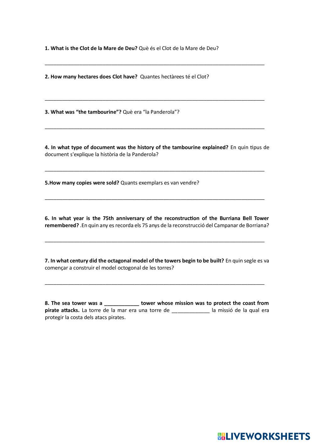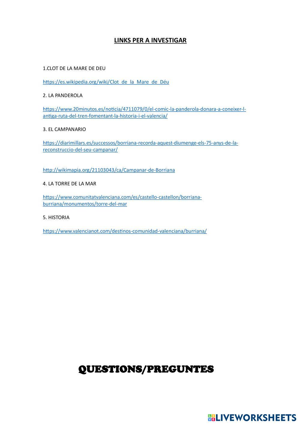 Created byALBA HERNAIZ projecte BURRIANA Age 10-18 level: 4T English Author's Instructions My Google Classroom Courses × 0 classes selected (0 students total) Quick Access Select all classes (0 classes) All Classes Loading courses... Cancel Share Share to selected Course __COURSE_NAME__ __STUDENT_NAME__ (__STUDENT_EMAIL__) INVESTIGATE BURRIANA Download Worksheet Validation Check my answers Emails my answers to my teacher Full name Group/level School subject Teacher's email or key code Close Submit Validating worksheet... (12) Your answers have been sent to your teacher. Good luck! OK We encountered an error submitting your answers. Please try again. OK Advertisement | Go Ad Free Created byALBA HERNAIZ projecte BURRIANA Age 10-18 level: 4T English Author's Instructions