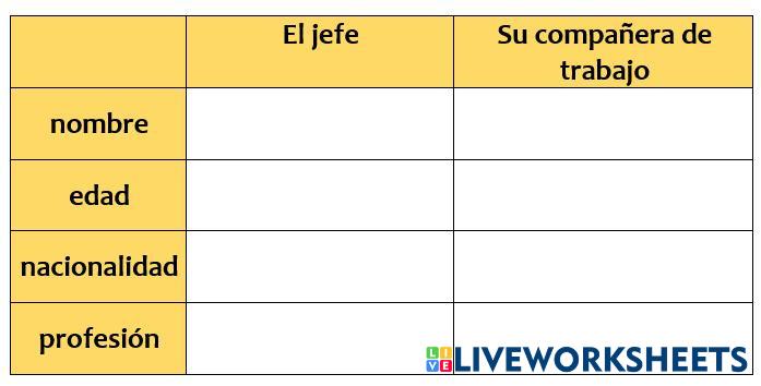 Created byLucía Andrea Martínez questions Questions Age 18+ level: adultos English Author's Instructions My Google Classroom Courses × 0 classes selected (0 students total) Quick Access Select all classes (0 classes) All Classes Loading courses... Cancel Share Share to selected Course __COURSE_NAME__ __STUDENT_NAME__ (__STUDENT_EMAIL__) Completá la tabla Download Worksheet Validation Check my answers Emails my answers to my teacher Full name Group/level School subject Teacher's email or key code Close Submit Validating worksheet... (12) Your answers have been sent to your teacher. Good luck! OK We encountered an error submitting your answers. Please try again. OK Advertisement | Go Ad Free Created byLucía Andrea Martínez questions Questions Age 18+ level: adultos English Author's Instructions
