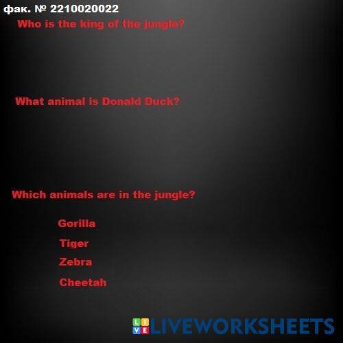 Created byVeselin questions animals Age 13+ level: 1 English Author's Instructions My Google Classroom Courses × 0 classes selected (0 students total) Quick Access Select all classes (0 classes) All Classes Loading courses... Cancel Share Share to selected Course __COURSE_NAME__ __STUDENT_NAME__ (__STUDENT_EMAIL__) Animals Download Worksheet Validation Check my answers Emails my answers to my teacher Full name Group/level School subject Teacher's email or key code Close Submit Validating worksheet... (12) Your answers have been sent to your teacher. Good luck! OK We encountered an error submitting your answers. Please try again. OK Advertisement | Go Ad Free Created byVeselin questions animals Age 13+ level: 1 English Author's Instructions