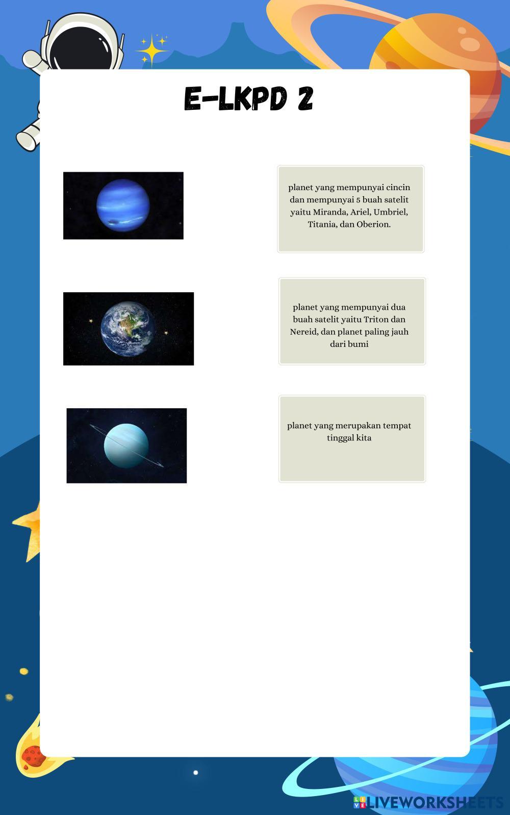 Created byKANIA YOSA NADILA sains sistem tata surya Age 7-15 level: 6 English Author's Instructions My Google Classroom Courses × 0 classes selected (0 students total) Quick Access Select all classes (0 classes) All Classes Loading courses... Cancel Share Share to selected Course __COURSE_NAME__ __STUDENT_NAME__ (__STUDENT_EMAIL__) E-LKPD MENJELAJAHI BUMI DAN ANTARIKSA Download Worksheet Validation Check my answers Emails my answers to my teacher Full name Group/level School subject Teacher's email or key code Close Submit Validating worksheet... (12) Your answers have been sent to your teacher. Good luck! OK We encountered an error submitting your answers. Please try again. OK Advertisement | Go Ad Free Created byKANIA YOSA NADILA sains sistem tata surya Age 7-15 level: 6 English Author's Instructions