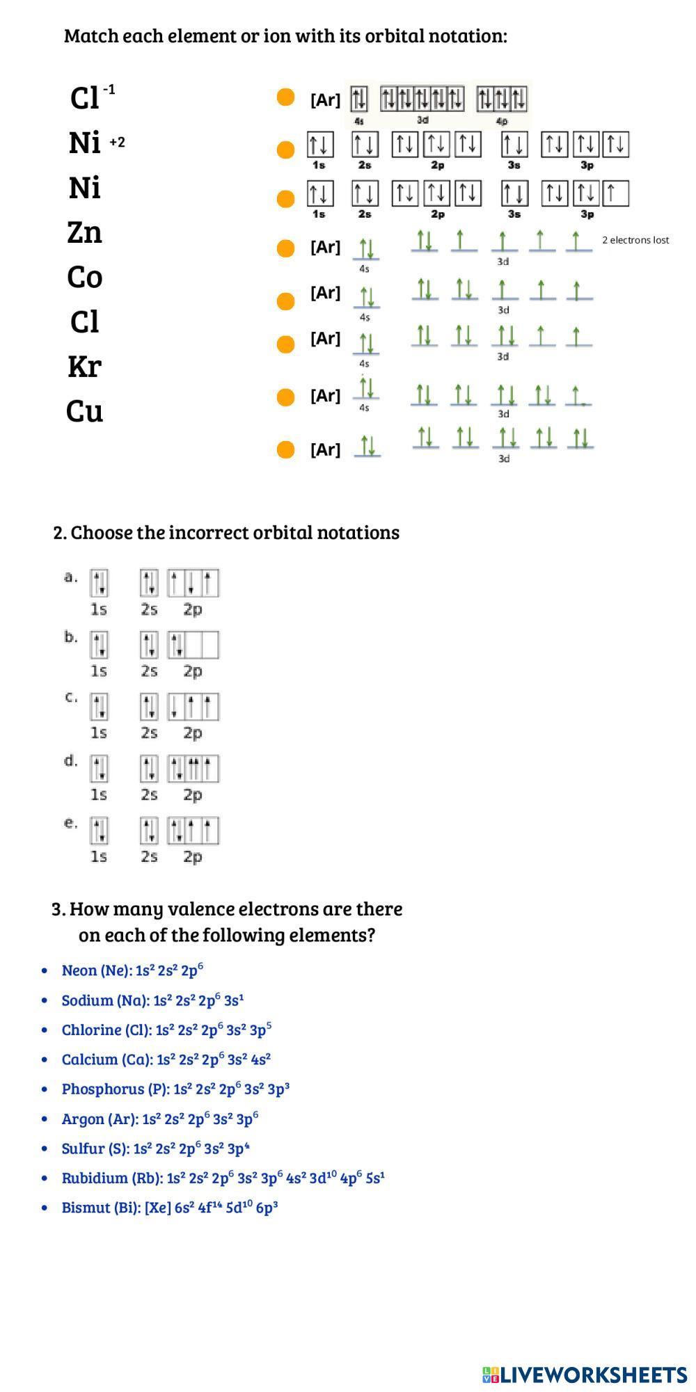 Created by jemunoz Science Bilingual Electron configuration, Aufbau diagram Age 12+ level: 9th English Author's Instructions My Google Classroom Courses × 0 classes selected (0 students total) Quick Access Select all classes (0 classes) All Classes Loading courses... Cancel Share Share to selected Course __COURSE_NAME__ __STUDENT_NAME__ (__STUDENT_EMAIL__) Electron Configuration Download Worksheet Validation Check my answers Emails my answers to my teacher Full name Group/level School subject Teacher's email or key code Close Submit Validating worksheet... (12) Your answers have been sent to your teacher. Good luck! OK We encountered an error submitting your answers. Please try again. OK Advertisement | Go Ad Free Created by jemunoz Science Bilingual Electron configuration, Aufbau diagram Age 12+ level: 9th English Author's Instructions