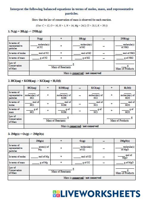 Interpret the following balanced equations in terms of moles, mass, and representative particles.