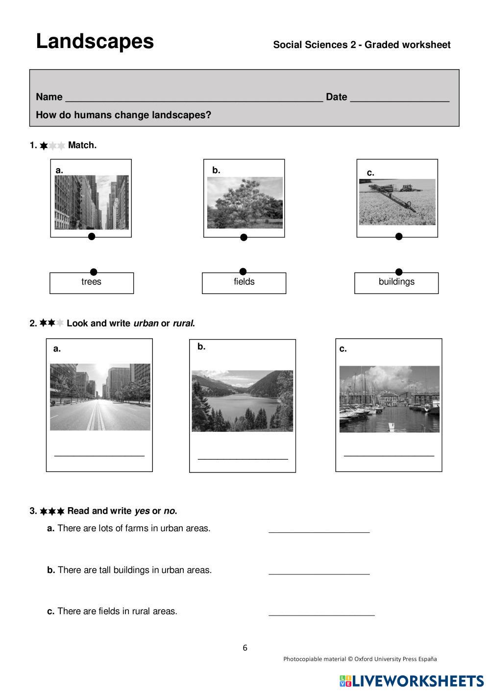 Created bySara Lázaro Narganes Science Elementary 2nd grade Earth Science English Author's Instructions COnmplete the activities My Google Classroom Courses × 0 classes selected (0 students total) Quick Access Select all classes (0 classes) All Classes Loading courses... Cancel Share Share to selected Course __COURSE_NAME__ __STUDENT_NAME__ (__STUDENT_EMAIL__) LANDSCAPES How do humans change landscapes? Download Worksheet Validation Check my answers Emails my answers to my teacher Full name Group/level School subject Teacher's email or key code Close Submit Validating worksheet... (12) Your answers have been sent to your teacher. Good luck! OK We encountered an error submitting your answers. Please try again. OK Advertisement | Go Ad Free Created bySara Lázaro Narganes Science Elementary 2nd grade Earth Science English Author's Instructions COnmplete the activities Explore Worksheets LANDSCAPES What causes air and water pollution? Science 2nd grade LANDSCAPES What causes air and water pollution? Earth Science - Science Complete the worksheet LANDSCAPES How do humans change landscapes? (2) Science 2nd grade LANDSCAPES How do humans change landscapes? (2) Earth Science - Science Complete the activities LANDSCAPES How are rural and urban landscapes different? Science 2nd grade LANDSCAPES How are rural and urban landscapes different? Earth Science - Science Complete the exercises LANDSCAPES What can you see in a coastal landscape? Science 2nd grade LANDSCAPES What can you see in a coastal landscape? Earth Science - Science Complete the activities.