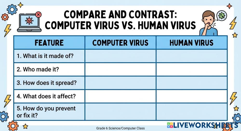 Created by bayansalem1 Science Middle School 6th grade Earth Science English Author's Instructions please Fill the following table My Google Classroom Courses × 0 classes selected (0 students total) Quick Access Select all classes (0 classes) All Classes Loading courses... Cancel Share Share to selected Course __COURSE_NAME__ __STUDENT_NAME__ (__STUDENT_EMAIL__) Human Viruses Vs Computer Viruses Download Worksheet Validation Check my answers Emails my answers to my teacher Full name Group/level School subject Teacher's email or key code Close Submit Validating worksheet... (12) Your answers have been sent to your teacher. Good luck! OK We encountered an error submitting your answers. Please try again. OK Advertisement | Go Ad Free Created by bayansalem1 Science Middle School 6th grade Earth Science English Author's Instructions please Fill the following table Explore Worksheets States of matter Science 6th grade States of matter Earth Science - Science Please do it with the understanding of the topic Khoa học tự nhiên 6 Science 6th grade Khoa học tự nhiên 6 Earth Science - Science Khoá lưỡng phân Climatul Europei Science 6th grade Climatul Europei Earth Science - Science Elevii identifica tipurile principale de climat din Europa Minerales y rocas Science 6th grade Minerales y rocas Earth Science - Science Completa las actividades
