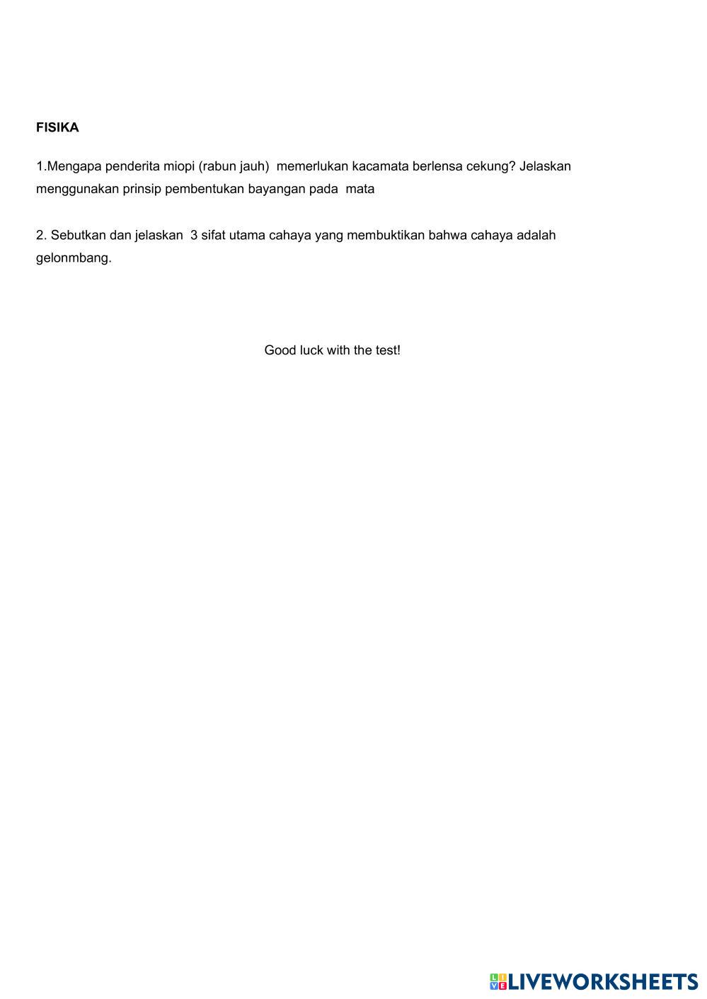 Created byMerry Science High School 12th grade Environmental Science English Author's Instructions Good luck with the test! My Google Classroom Courses × 0 classes selected (0 students total) Quick Access Select all classes (0 classes) All Classes Loading courses... Cancel Share Share to selected Course __COURSE_NAME__ __STUDENT_NAME__ (__STUDENT_EMAIL__) UTS IPA Download Worksheet Validation Check my answers Emails my answers to my teacher Full name Group/level School subject Teacher's email or key code Close Submit Validating worksheet... (12) Your answers have been sent to your teacher. Good luck! OK We encountered an error submitting your answers. Please try again. OK Advertisement | Go Ad Free Created byMerry Science High School 12th grade Environmental Science English Author's Instructions Good luck with the test! Explore Worksheets Identification Science 12th grade Identification Environmental Science - Science Identify the following based from the choices inside the box. Identification Science 12th grade Identification Environmental Science - Science Identify the following based from the choices inside the box. EVALUASI PELATIHAN LITERASI DAN NUMERASI Science 12th grade EVALUASI PELATIHAN LITERASI DAN NUMERASI Environmental Science - Science Pilihlah jawaban yang paling benar Contabilidad Science 12th grade Contabilidad Environmental Science - Science Relaciona las columnas
