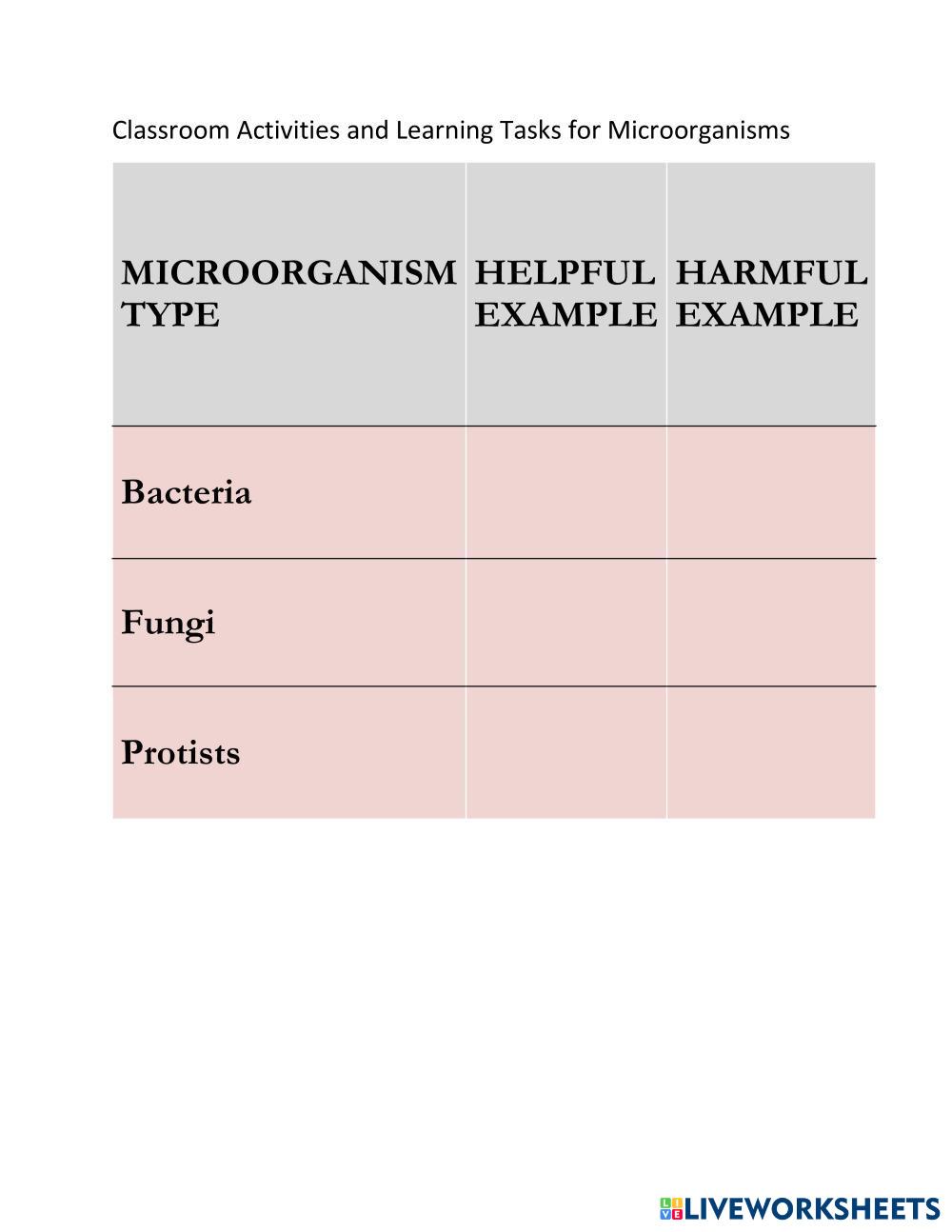 complete the task sheet related with if the microorganisms are helpful or harmful