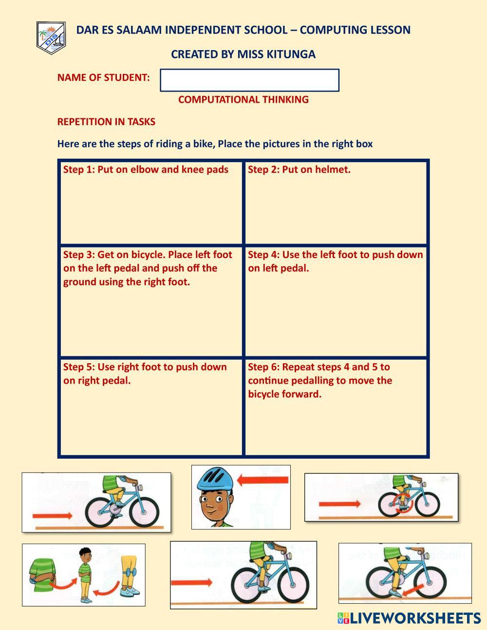 Here are the steps of riding a bike, Place the pictures in the right box