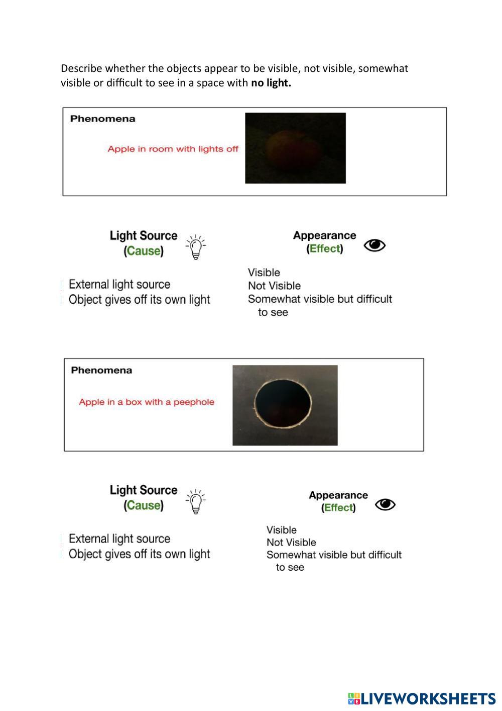 Created byAlissar Kenaan Science Light and dark Age 6-15 level: grade 01 English Author's Instructions My Google Classroom Courses × 0 classes selected (0 students total) Quick Access Select all classes (0 classes) All Classes Loading courses... Cancel Share Share to selected Course __COURSE_NAME__ __STUDENT_NAME__ (__STUDENT_EMAIL__) Describe whether the objects appear to be visible, not visible, somewhat visible or difficult to see in a space with no light. Download Worksheet Validation Check my answers Emails my answers to my teacher Full name Group/level School subject Teacher's email or key code Close Submit Validating worksheet... (12) Your answers have been sent to your teacher. Good luck! OK We encountered an error submitting your answers. Please try again. OK Advertisement | Go Ad Free Created byAlissar Kenaan Science Light and dark Age 6-15 level: grade 01 English Author's Instructions