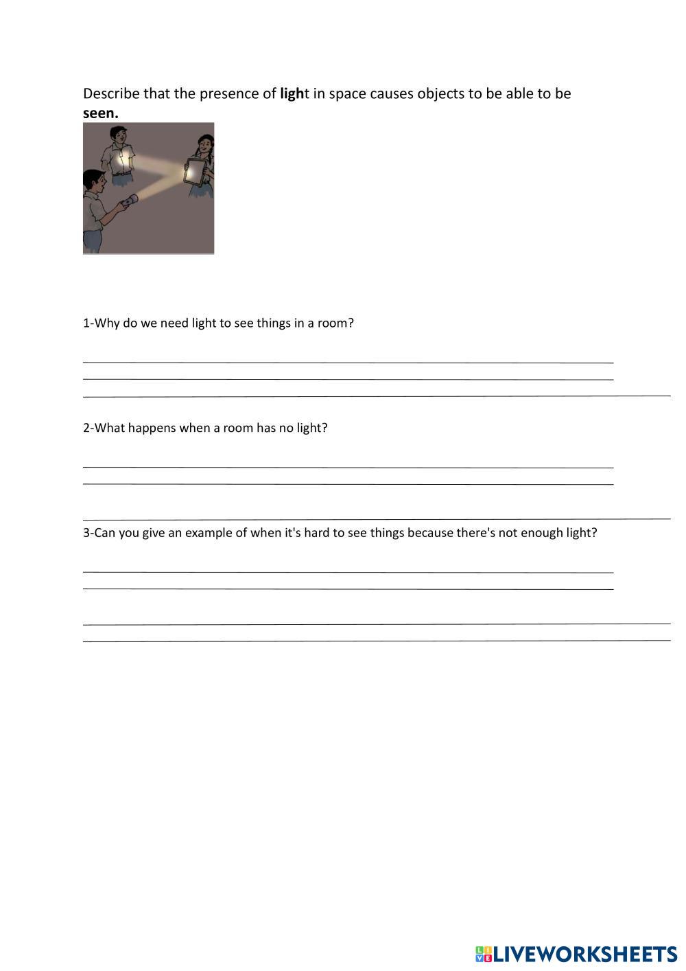 Created byAlissar Kenaan Science Light and dark Age 6-16 level: grade 01 English Author's Instructions My Google Classroom Courses × 0 classes selected (0 students total) Quick Access Select all classes (0 classes) All Classes Loading courses... Cancel Share Share to selected Course __COURSE_NAME__ __STUDENT_NAME__ (__STUDENT_EMAIL__) Describe that the presence of light in space causes objects to be able to be seen. Download Worksheet Validation Check my answers Emails my answers to my teacher Full name Group/level School subject Teacher's email or key code Close Submit Validating worksheet... (12) Your answers have been sent to your teacher. Good luck! OK We encountered an error submitting your answers. Please try again. OK Advertisement | Go Ad Free Created byAlissar Kenaan Science Light and dark Age 6-16 level: grade 01 English Author's Instructions