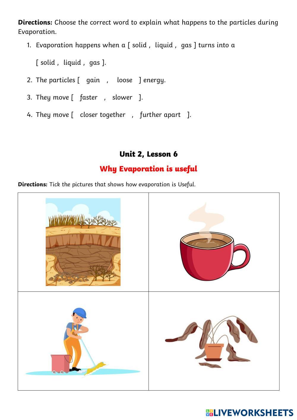 Created by lanhavu2211 Science Evaporation Age 7-13 level: 4 English Author's Instructions review My Google Classroom Courses × 0 classes selected (0 students total) Quick Access Select all classes (0 classes) All Classes Loading courses... Cancel Share Share to selected Course __COURSE_NAME__ __STUDENT_NAME__ (__STUDENT_EMAIL__) G4_UNIT3_L1&2 Download Worksheet Validation Check my answers Emails my answers to my teacher Full name Group/level School subject Teacher's email or key code Close Submit Validating worksheet... (12) Your answers have been sent to your teacher. Good luck! OK We encountered an error submitting your answers. Please try again. OK Advertisement | Go Ad Free Created by lanhavu2211 Science Evaporation Age 7-13 level: 4 English Author's Instructions review