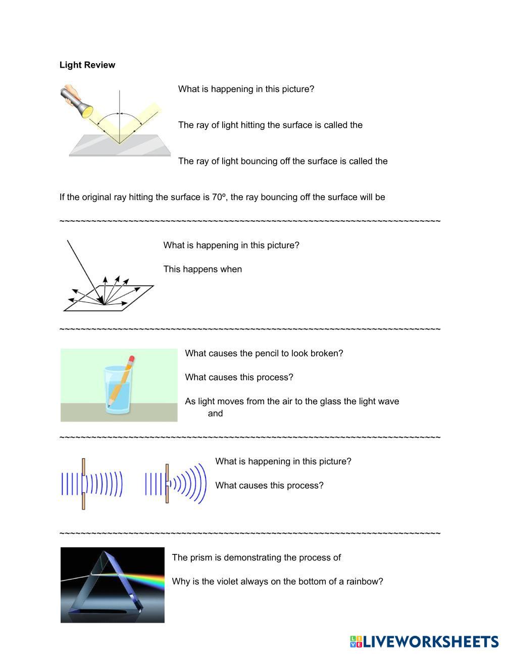 Created byKimberly Keech Science Properties of light Age 11-17 level: 6-8 English Author's Instructions My Google Classroom Courses × 0 classes selected (0 students total) Quick Access Select all classes (0 classes) All Classes Loading courses... Cancel Share Share to selected Course __COURSE_NAME__ __STUDENT_NAME__ (__STUDENT_EMAIL__) Light Review Download Worksheet Validation Check my answers Emails my answers to my teacher Full name Group/level School subject Teacher's email or key code Close Submit Validating worksheet... (12) Your answers have been sent to your teacher. Good luck! OK We encountered an error submitting your answers. Please try again. OK Advertisement | Go Ad Free Created byKimberly Keech Science Properties of light Age 11-17 level: 6-8 English Author's Instructions