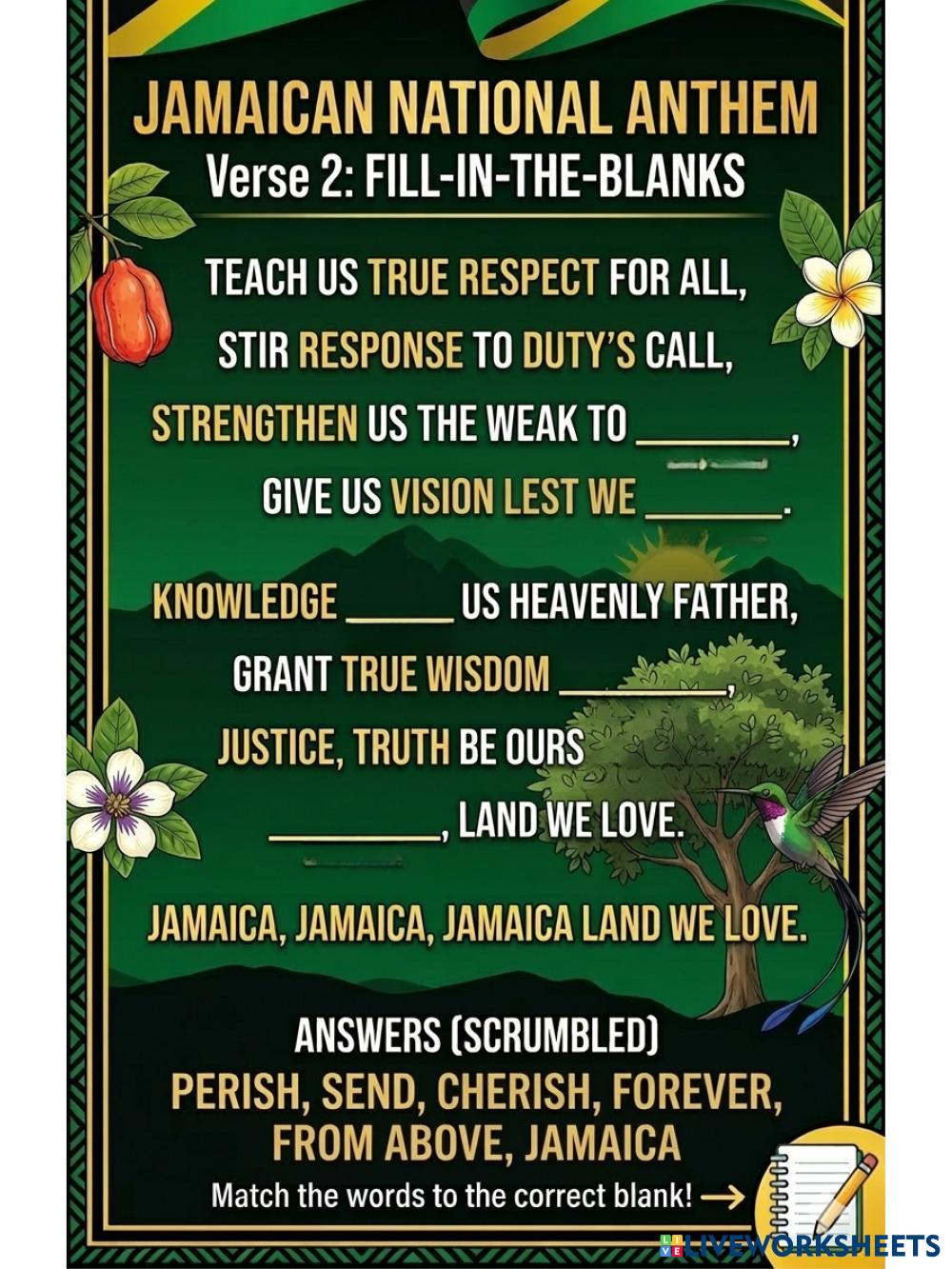 Created by candicew Social Studies Middle School 7th grade Civics and Government English Author's Instructions Fill in the blanks to complete verse 2 of Jamaica's National Anthem. Drag the words to the spaces. My Google Classroom Courses × 0 classes selected (0 students total) Quick Access Select all classes (0 classes) All Classes Loading courses... Cancel Share Share to selected Course __COURSE_NAME__ __STUDENT_NAME__ (__STUDENT_EMAIL__) Jamaica: National Anthem Verse 2 Download Worksheet Validation Check my answers Emails my answers to my teacher Full name Group/level School subject Teacher's email or key code Close Submit Validating worksheet... (12) Your answers have been sent to your teacher. Good luck! OK We encountered an error submitting your answers. Please try again. OK Advertisement | Go Ad Free Created by candicew Social Studies Middle School 7th grade Civics and Government English Author's Instructions Fill in the blanks to complete verse 2 of Jamaica's National Anthem. Drag the words to the spaces. Explore Worksheets CHUDECHUNGLOP7 Social Studies 7th grade CHUDECHUNGLOP7 Civics and Government - Social Studies Khong CHUDECHUNG7 Social Studies 7th grade CHUDECHUNG7 Civics and Government - Social Studies KHÔNG แบบทดสอบก่อนเรียน Social Studies 7th grade แบบทดสอบก่อนเรียน Civics and Government - Social Studies - แบบทดสอบก่อนเรียน Social Studies 7th grade แบบทดสอบก่อนเรียน Civics and Government - Social Studies -