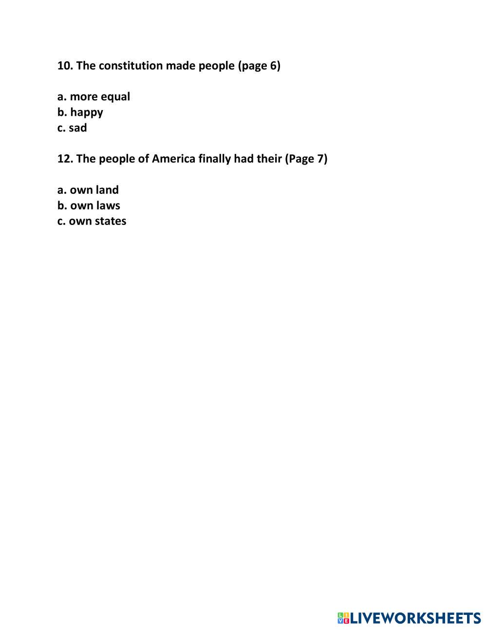 Created byCristina Valle Social Studies High School 12th grade History English Author's Instructions FOLLOW INSTRUCTIONS My Google Classroom Courses × 0 classes selected (0 students total) Quick Access Select all classes (0 classes) All Classes Loading courses... Cancel Share Share to selected Course __COURSE_NAME__ __STUDENT_NAME__ (__STUDENT_EMAIL__) ONE NEW NATION Download Worksheet Validation Check my answers Emails my answers to my teacher Full name Group/level School subject Teacher's email or key code Close Submit Validating worksheet... (12) Your answers have been sent to your teacher. Good luck! OK We encountered an error submitting your answers. Please try again. OK Advertisement | Go Ad Free Created byCristina Valle Social Studies High School 12th grade History English Author's Instructions FOLLOW INSTRUCTIONS Explore Worksheets ALGUNOS ELEMENTOS DE LA ARQUITECTURA CLÁSICA Social Studies 12th grade ALGUNOS ELEMENTOS DE LA ARQUITECTURA CLÁSICA History - Social Studies Denomina los elementos arquitectónicos que se muestran en la imagen. Domnitori români Social Studies 12th grade Domnitori români History - Social Studies Completați răspunsurile corecte folosind diacriticele și regulile de ortografie și punctuație sejarah kelas x Social Studies 12th grade sejarah kelas x History - Social Studies kerjakan dengan teliti SOAL SEJARAH UMUM XII Social Studies 12th grade SOAL SEJARAH UMUM XII History - Social Studies Kerjakan Soal