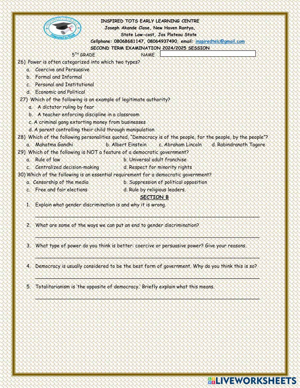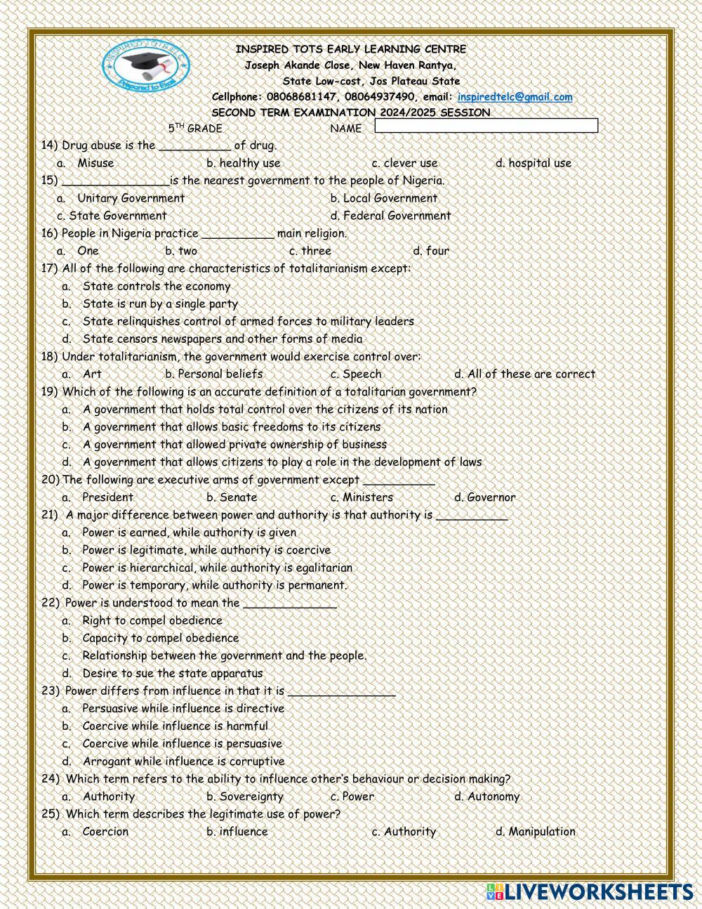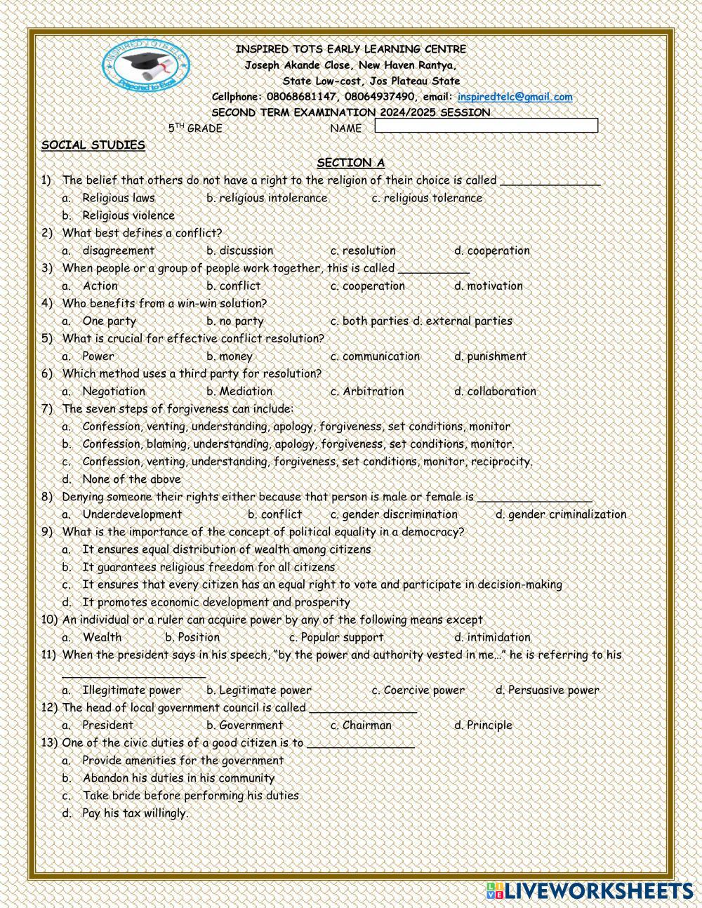 Created byMusa David Zoaka SOCIAL STUDIES SOCIAL STUDIES Age 9-15 level: 5TH GRADE English Author's Instructions My Google Classroom Courses × 0 classes selected (0 students total) Quick Access Select all classes (0 classes) All Classes Loading courses... Cancel Share Share to selected Course __COURSE_NAME__ __STUDENT_NAME__ (__STUDENT_EMAIL__) INSPIRED TOTS EARLY LEARNING CENTRE RANTIYA JOS Download Worksheet Validation Check my answers Emails my answers to my teacher Full name Group/level School subject Teacher's email or key code Close Submit Validating worksheet... (12) Your answers have been sent to your teacher. Good luck! OK We encountered an error submitting your answers. Please try again. OK Advertisement | Go Ad Free Created byMusa David Zoaka SOCIAL STUDIES SOCIAL STUDIES Age 9-15 level: 5TH GRADE English Author's Instructions