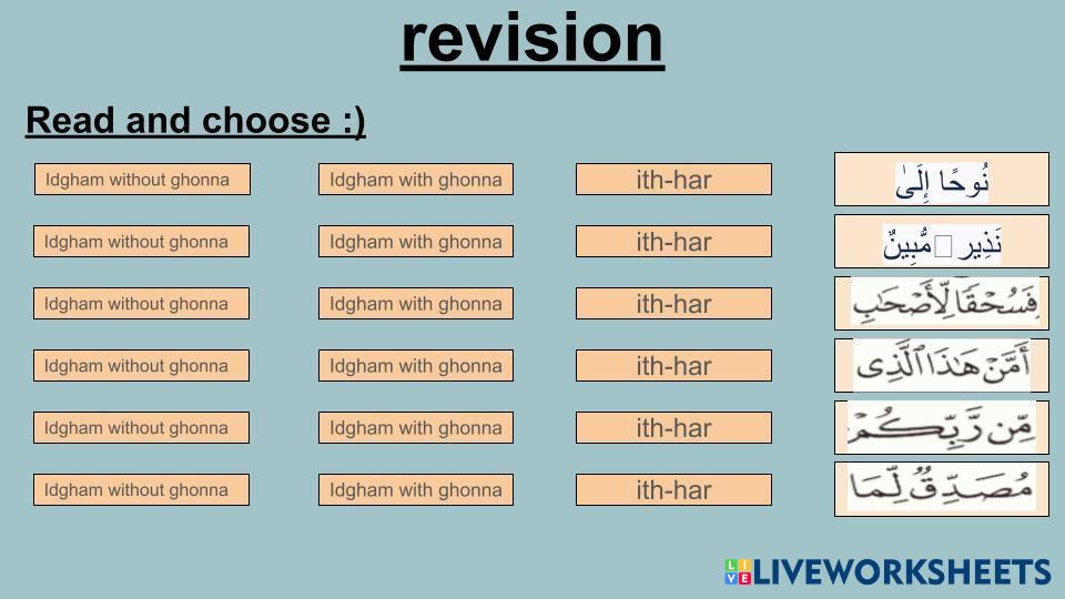 Created bysherine mohamed soliman TAJWEED revision Age 8+ level: 1 English Author's Instructions My Google Classroom Courses × 0 classes selected (0 students total) Quick Access Select all classes (0 classes) All Classes Loading courses... Cancel Share Share to selected Course __COURSE_NAME__ __STUDENT_NAME__ (__STUDENT_EMAIL__) revision Download Worksheet Validation Check my answers Emails my answers to my teacher Full name Group/level School subject Teacher's email or key code Close Submit Validating worksheet... (12) Your answers have been sent to your teacher. Good luck! OK We encountered an error submitting your answers. Please try again. OK Advertisement | Go Ad Free Created bysherine mohamed soliman TAJWEED revision Age 8+ level: 1 English Author's Instructions
