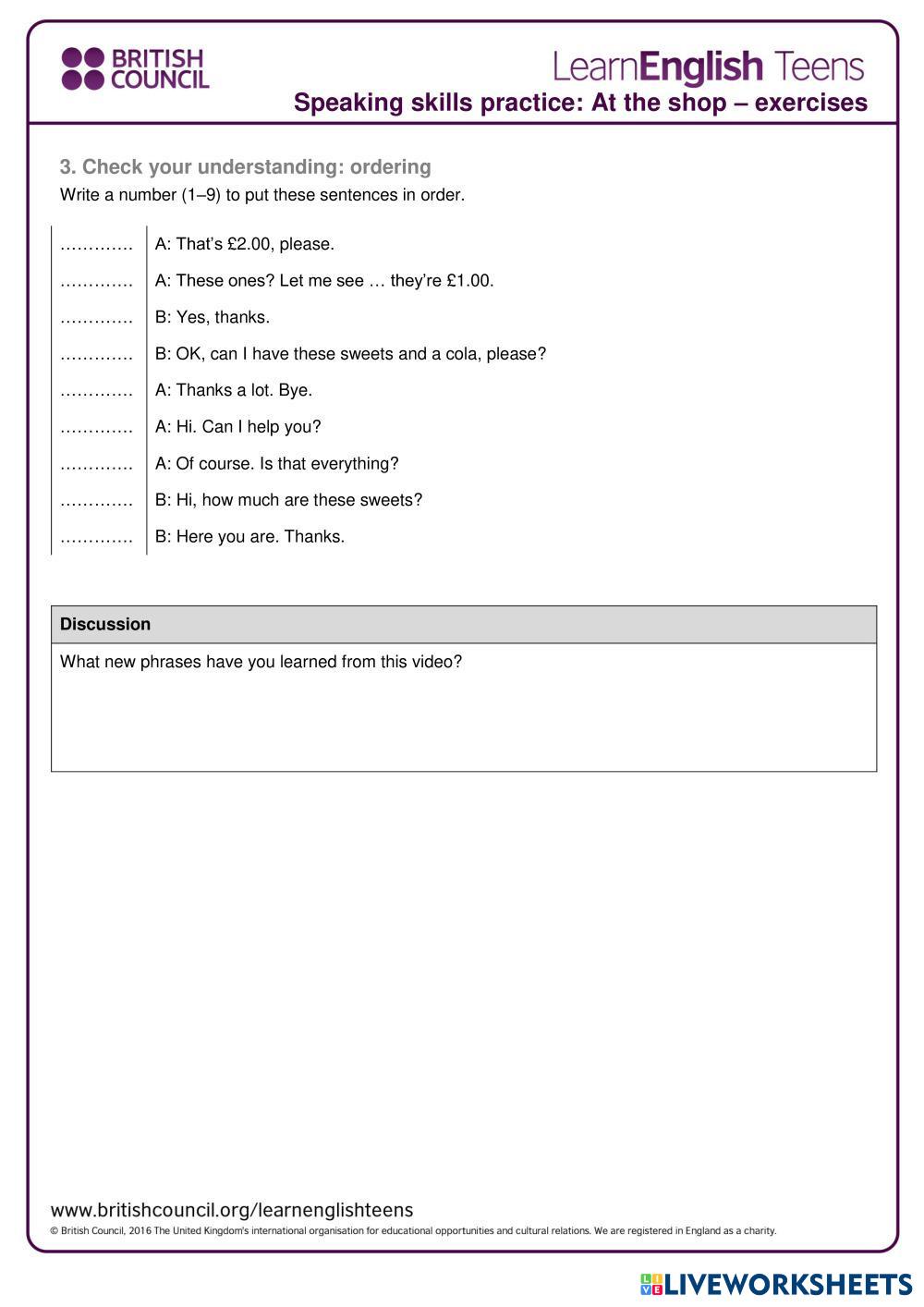 Created byAilyn Taller de ingles Vocabualry related to shop Age 11+ level: 2do English Author's Instructions My Google Classroom Courses × 0 classes selected (0 students total) Quick Access Select all classes (0 classes) All Classes Loading courses... Cancel Share Share to selected Course __COURSE_NAME__ __STUDENT_NAME__ (__STUDENT_EMAIL__) AT THE SHOP Download Worksheet Validation Check my answers Emails my answers to my teacher Full name Group/level School subject Teacher's email or key code Close Submit Validating worksheet... (12) Your answers have been sent to your teacher. Good luck! OK We encountered an error submitting your answers. Please try again. OK Advertisement | Go Ad Free Created byAilyn Taller de ingles Vocabualry related to shop Age 11+ level: 2do English Author's Instructions