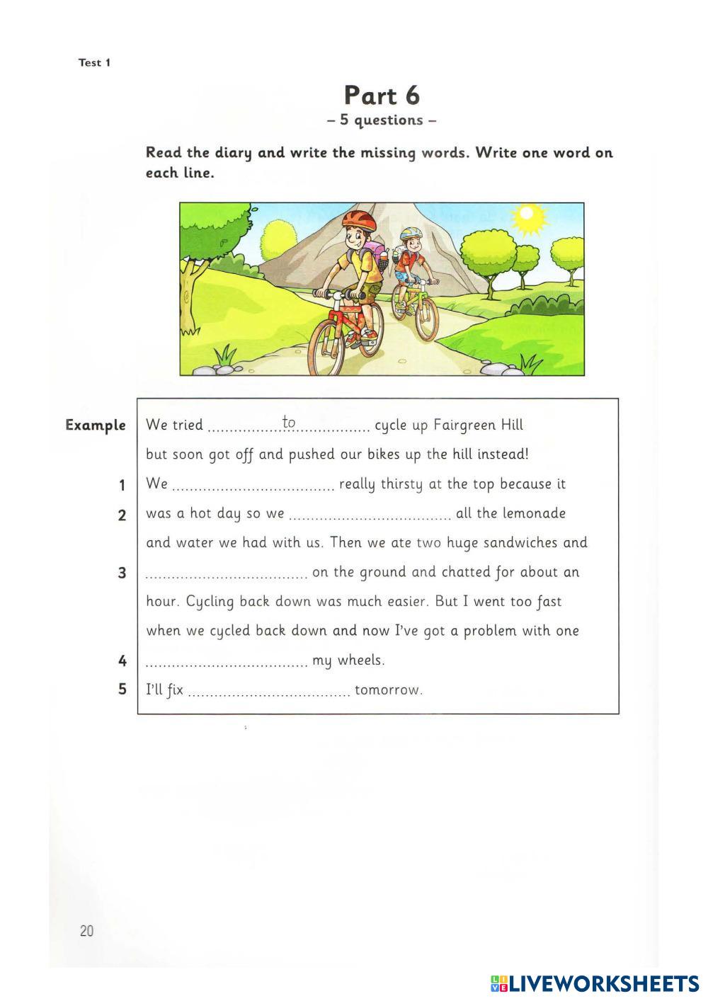 Created byPham Thi Yen Nhi Test 1 PART 6 Age 9-15 level: Flyers English Author's Instructions My Google Classroom Courses × 0 classes selected (0 students total) Quick Access Select all classes (0 classes) All Classes Loading courses... Cancel Share Share to selected Course __COURSE_NAME__ __STUDENT_NAME__ (__STUDENT_EMAIL__) READING AND WRITING Download Worksheet Validation Check my answers Emails my answers to my teacher Full name Group/level School subject Teacher's email or key code Close Submit Validating worksheet... (12) Your answers have been sent to your teacher. Good luck! OK We encountered an error submitting your answers. Please try again. OK Advertisement | Go Ad Free Created byPham Thi Yen Nhi Test 1 PART 6 Age 9-15 level: Flyers English Author's Instructions