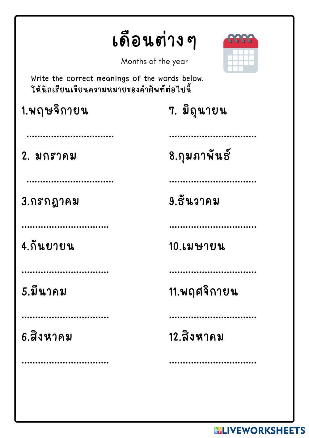Created byThanagit Owen Thianthing Thai vocabulary Age 8-18 level: Grade 6 English Author's Instructions My Google Classroom Courses × 0 classes selected (0 students total) Quick Access Select all classes (0 classes) All Classes Loading courses... Cancel Share Share to selected Course __COURSE_NAME__ __STUDENT_NAME__ (__STUDENT_EMAIL__) Thai months of the year Download Worksheet Validation Check my answers Emails my answers to my teacher Full name Group/level School subject Teacher's email or key code Close Submit Validating worksheet... (12) Your answers have been sent to your teacher. Good luck! OK We encountered an error submitting your answers. Please try again. OK Advertisement | Go Ad Free Created byThanagit Owen Thianthing Thai vocabulary Age 8-18 level: Grade 6 English Author's Instructions