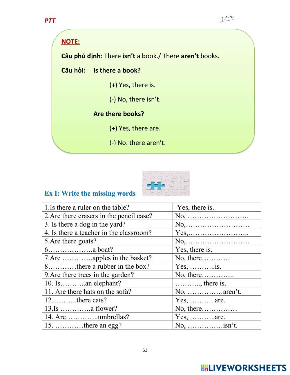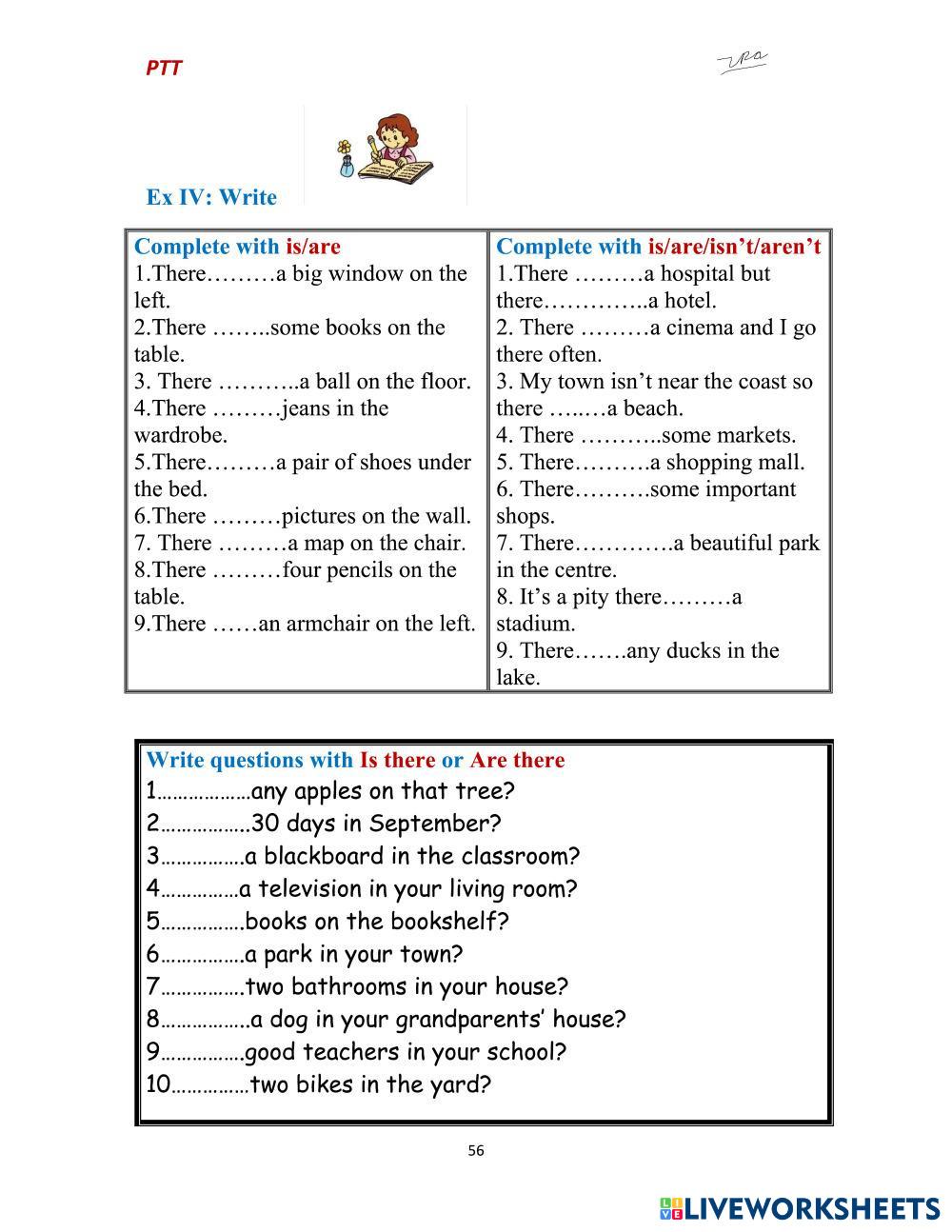 Created bySophia There is and there are There is and There are Age 9-16 level: Primary English Author's Instructions My Google Classroom Courses × 0 classes selected (0 students total) Quick Access Select all classes (0 classes) All Classes Loading courses... Cancel Share Share to selected Course __COURSE_NAME__ __STUDENT_NAME__ (__STUDENT_EMAIL__) There is - There are 2 Download Worksheet Validation Check my answers Emails my answers to my teacher Full name Group/level School subject Teacher's email or key code Close Submit Validating worksheet... (12) Your answers have been sent to your teacher. Good luck! OK We encountered an error submitting your answers. Please try again. OK Advertisement | Go Ad Free Created bySophia There is and there are There is and There are Age 9-16 level: Primary English Author's Instructions