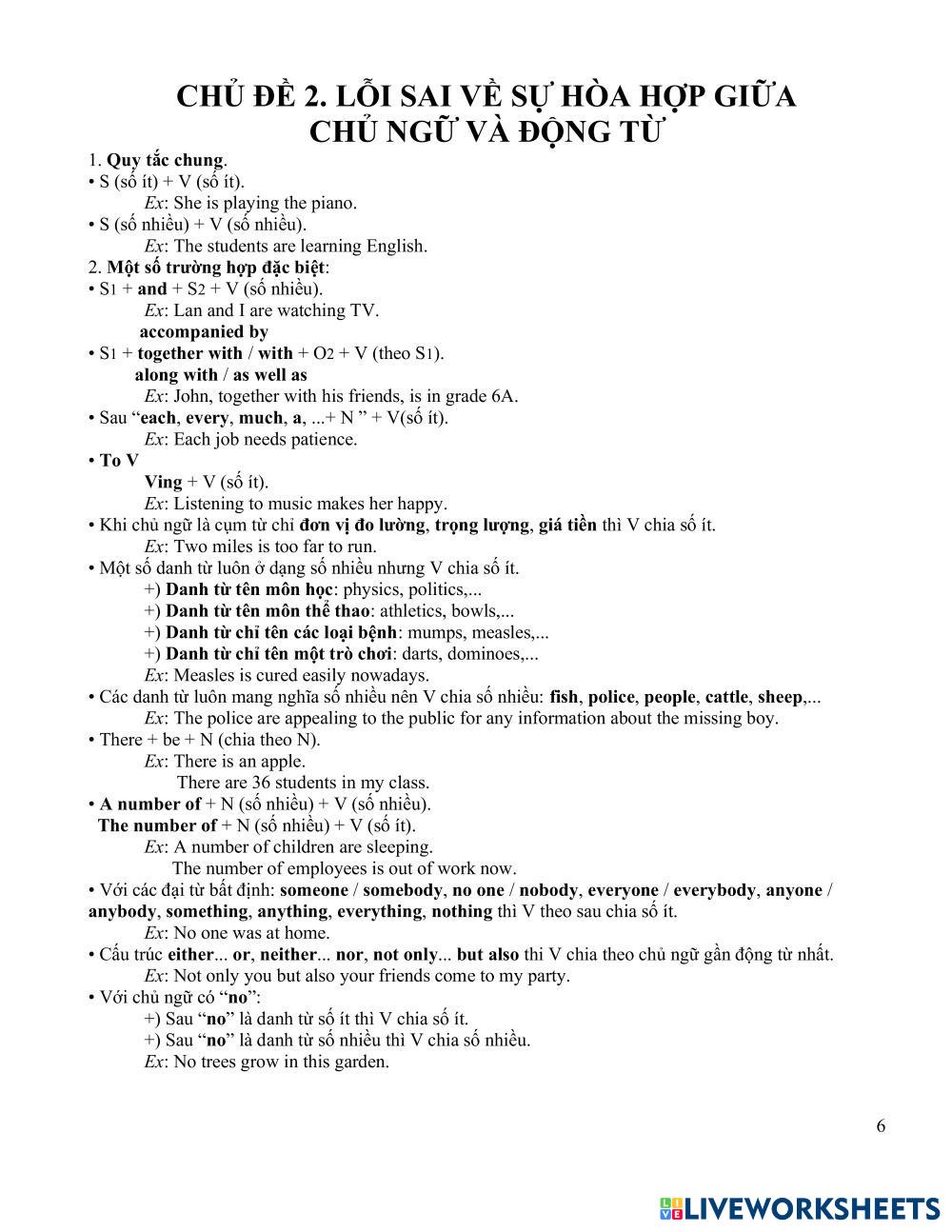 Created byMs Lien HEKA Tìm lỗi sai - Hòa hợp Chủ - Vị Tìm lỗi sai - Hòa hợp Chủ - Vị Age 9-15 level: Grade 6 English Author's Instructions Tìm lỗi sai - Hòa hợp Chủ - Vị My Google Classroom Courses × 0 classes selected (0 students total) Quick Access Select all classes (0 classes) All Classes Loading courses... Cancel Share Share to selected Course __COURSE_NAME__ __STUDENT_NAME__ (__STUDENT_EMAIL__) Tìm lỗi sai - Hòa hợp Chủ - Vị Download Worksheet Validation Check my answers Emails my answers to my teacher Full name Group/level School subject Teacher's email or key code Close Submit Validating worksheet... (12) Your answers have been sent to your teacher. Good luck! OK We encountered an error submitting your answers. Please try again. OK Advertisement | Go Ad Free Created byMs Lien HEKA Tìm lỗi sai - Hòa hợp Chủ - Vị Tìm lỗi sai - Hòa hợp Chủ - Vị Age 9-15 level: Grade 6 English Author's Instructions Tìm lỗi sai - Hòa hợp Chủ - Vị