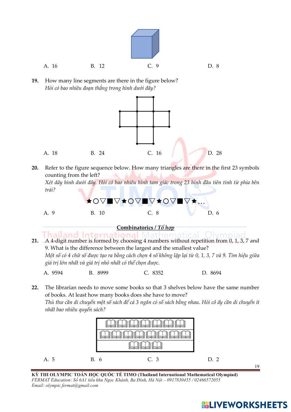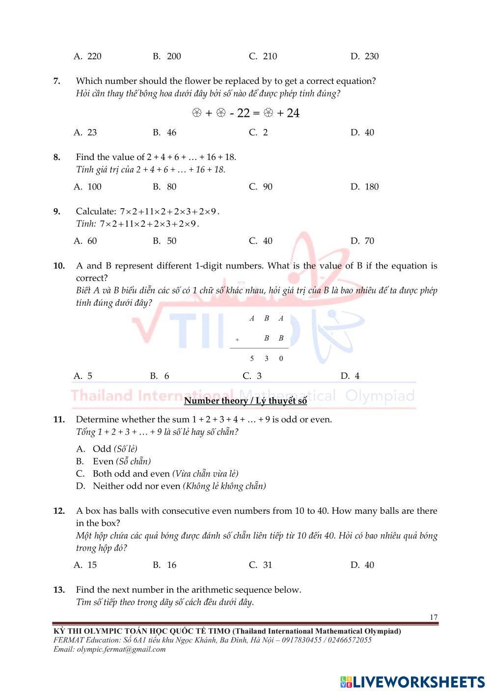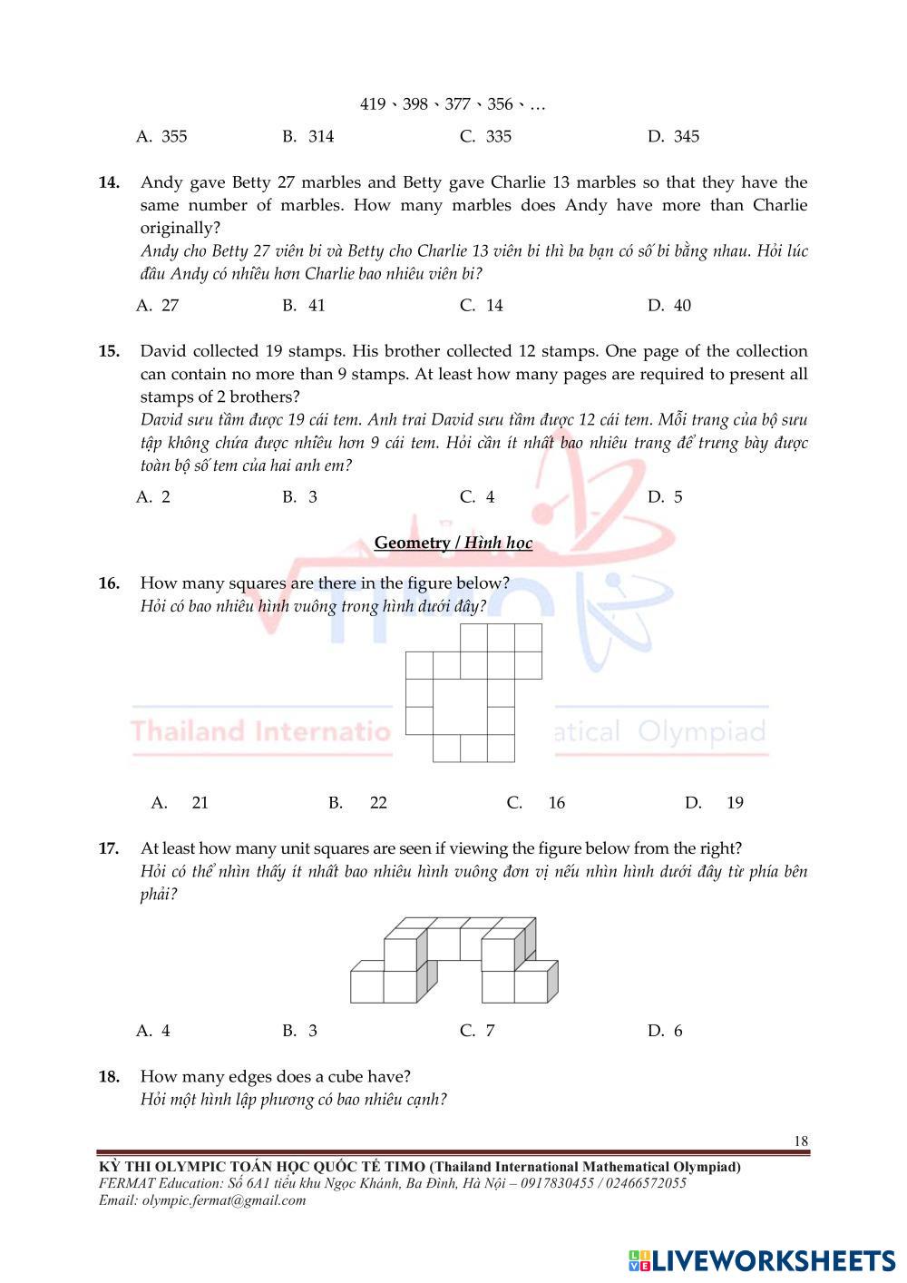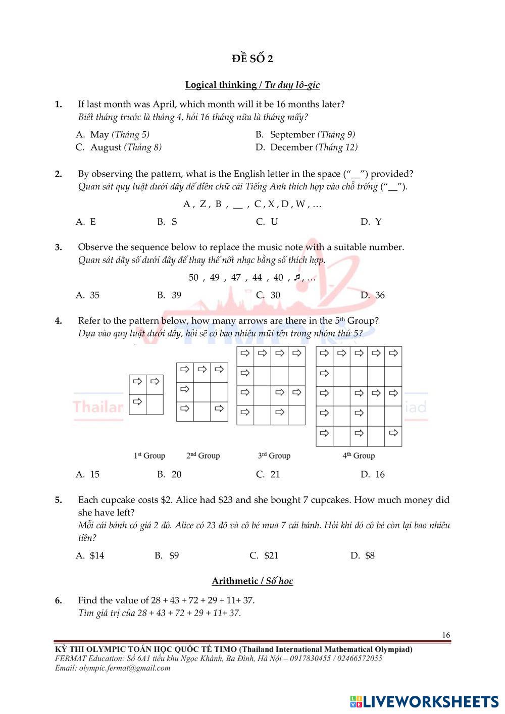 Created byNguyễn Thị Ái Linh TIMO Math TIMO Age 6-10 level: LỚP 2-3 English Author's Instructions My Google Classroom Courses × 0 classes selected (0 students total) Quick Access Select all classes (0 classes) All Classes Loading courses... Cancel Share Share to selected Course __COURSE_NAME__ __STUDENT_NAME__ (__STUDENT_EMAIL__) TIMO Khối 2 - Vòng loại Đề số 2 Download Worksheet Validation Check my answers Emails my answers to my teacher Full name Group/level School subject Teacher's email or key code Close Submit Validating worksheet... (12) Your answers have been sent to your teacher. Good luck! OK We encountered an error submitting your answers. Please try again. OK Advertisement | Go Ad Free Created byNguyễn Thị Ái Linh TIMO Math TIMO Age 6-10 level: LỚP 2-3 English Author's Instructions