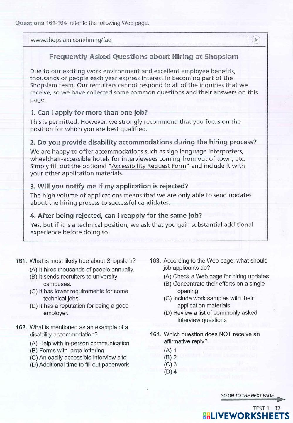 Created by Thuhuong98 TOEIC Reading and listening Age 18+ level: 850+ English Author's Instructions My Google Classroom Courses × 0 classes selected (0 students total) Quick Access Select all classes (0 classes) All Classes Loading courses... Cancel Share Share to selected Course __COURSE_NAME__ __STUDENT_NAME__ (__STUDENT_EMAIL__) YBM 3 - TEST 1 - PART 7 Download Worksheet Validation Check my answers Emails my answers to my teacher Full name Group/level School subject Teacher's email or key code Close Submit Validating worksheet... (12) Your answers have been sent to your teacher. Good luck! OK We encountered an error submitting your answers. Please try again. OK Advertisement | Go Ad Free Created by Thuhuong98 TOEIC Reading and listening Age 18+ level: 850+ English Author's Instructions