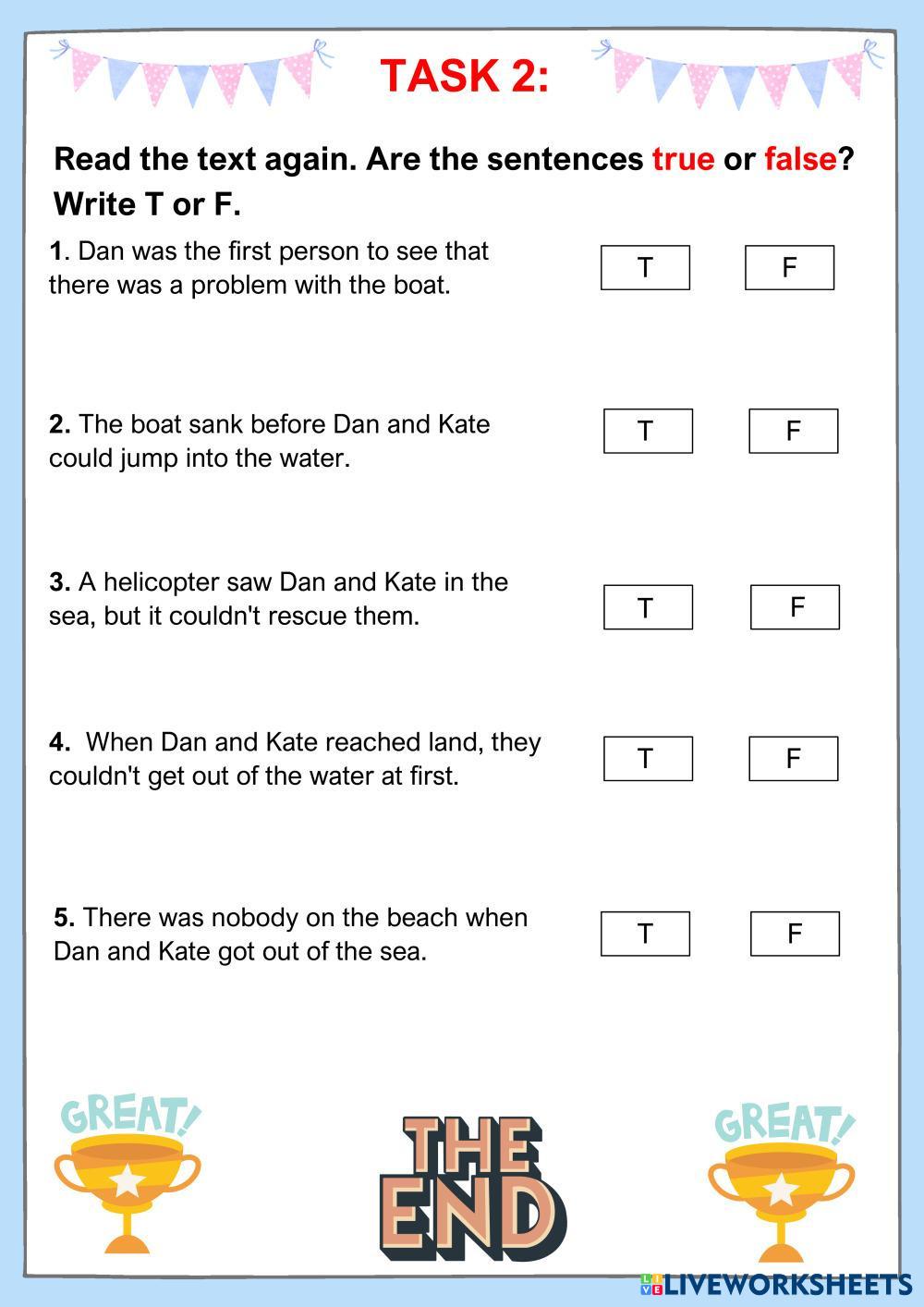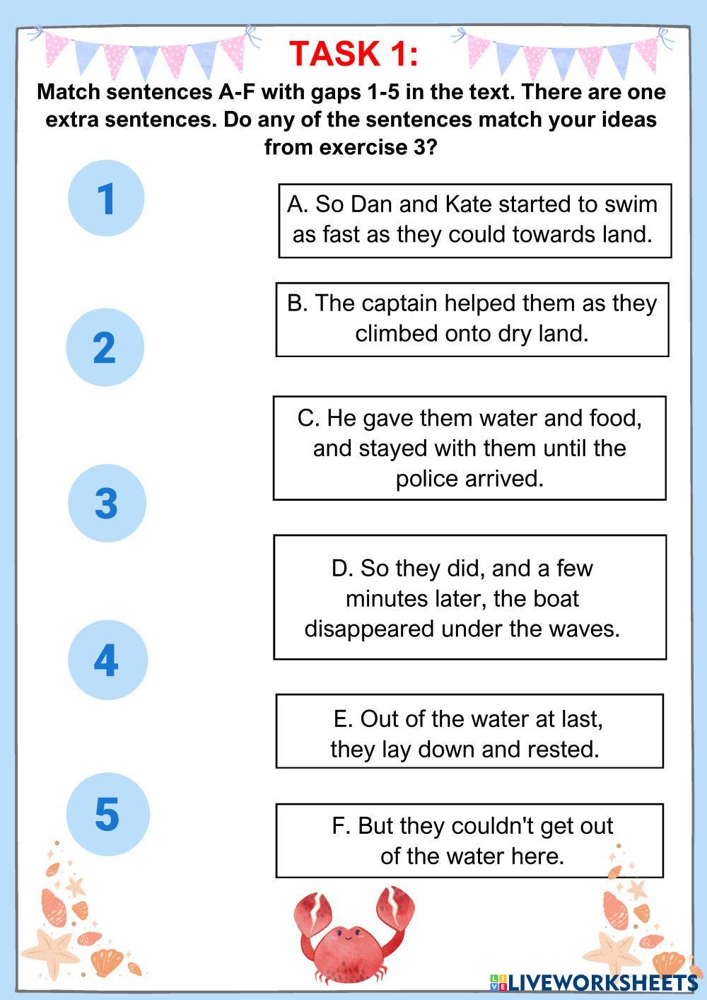 Created byPhan Thanh Yến Phương "Unit 2" Reading comprehension Age 15+ level: Grade 10 English Author's Instructions My Google Classroom Courses × 0 classes selected (0 students total) Quick Access Select all classes (0 classes) All Classes Loading courses... Cancel Share Share to selected Course __COURSE_NAME__ __STUDENT_NAME__ (__STUDENT_EMAIL__) URFLT-SA2204-G2-Unit 2F- LOST AT SEA -Phan Thanh Yến Phương Download Worksheet Validation Check my answers Emails my answers to my teacher Full name Group/level School subject Teacher's email or key code Close Submit Validating worksheet... (12) Your answers have been sent to your teacher. Good luck! OK We encountered an error submitting your answers. Please try again. OK Advertisement | Go Ad Free Created byPhan Thanh Yến Phương "Unit 2" Reading comprehension Age 15+ level: Grade 10 English Author's Instructions