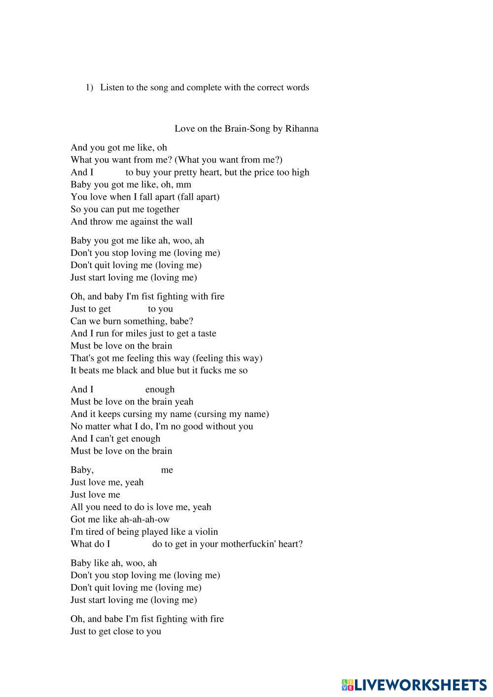 Created byMarioLoor Universidad Luis Vargas Cancion Age 18+ level: 4 English Author's Instructions My Google Classroom Courses × 0 classes selected (0 students total) Quick Access Select all classes (0 classes) All Classes Loading courses... Cancel Share Share to selected Course __COURSE_NAME__ __STUDENT_NAME__ (__STUDENT_EMAIL__) Love On The Brain Download Worksheet Validation Check my answers Emails my answers to my teacher Full name Group/level School subject Teacher's email or key code Close Submit Validating worksheet... (12) Your answers have been sent to your teacher. Good luck! OK We encountered an error submitting your answers. Please try again. OK Advertisement | Go Ad Free Created byMarioLoor Universidad Luis Vargas Cancion Age 18+ level: 4 English Author's Instructions