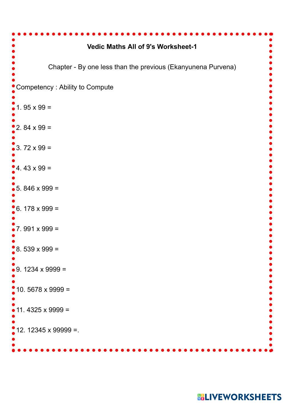 Created byChithra Dhananjayan vedic Maths Multiplication All of 9's Age 6+ level: 1 English Author's Instructions My Google Classroom Courses × 0 classes selected (0 students total) Quick Access Select all classes (0 classes) All Classes Loading courses... Cancel Share Share to selected Course __COURSE_NAME__ __STUDENT_NAME__ (__STUDENT_EMAIL__) Multipliction All of 9's Download Worksheet Validation Check my answers Emails my answers to my teacher Full name Group/level School subject Teacher's email or key code Close Submit Validating worksheet... (12) Your answers have been sent to your teacher. Good luck! OK We encountered an error submitting your answers. Please try again. OK Advertisement | Go Ad Free Created byChithra Dhananjayan vedic Maths Multiplication All of 9's Age 6+ level: 1 English Author's Instructions